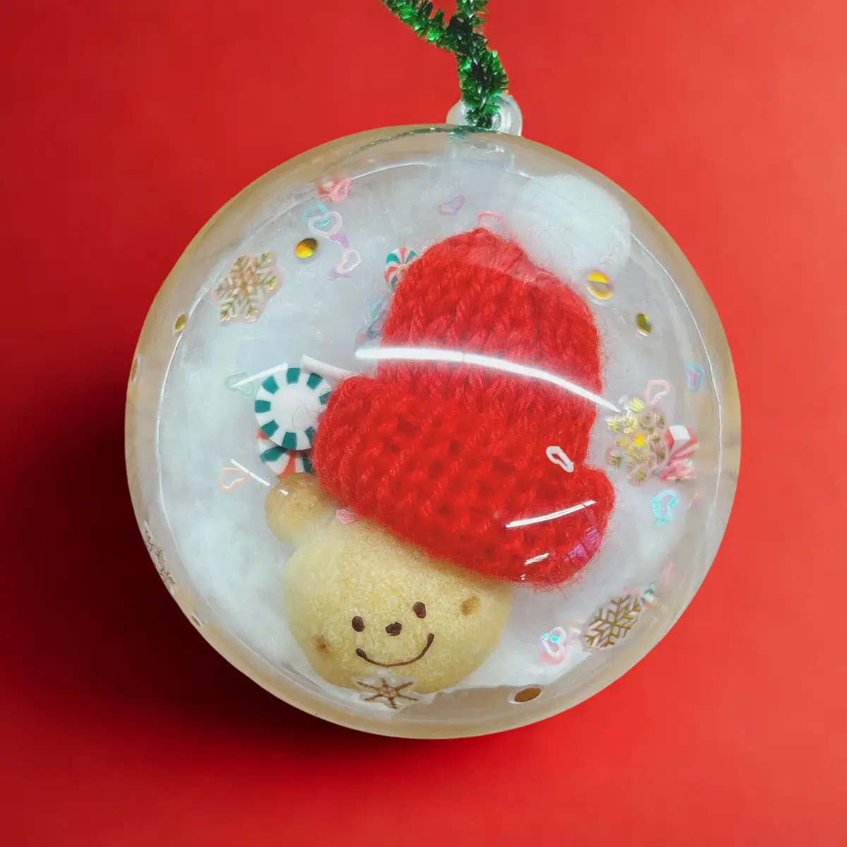 飾り用の生地で動物モチーフのパンを作り、その表面に表情を描き込んで綿やビーズと一緒にカプセルへ入れれば、オリジナルクリスマスオーナメントの出来上がり!