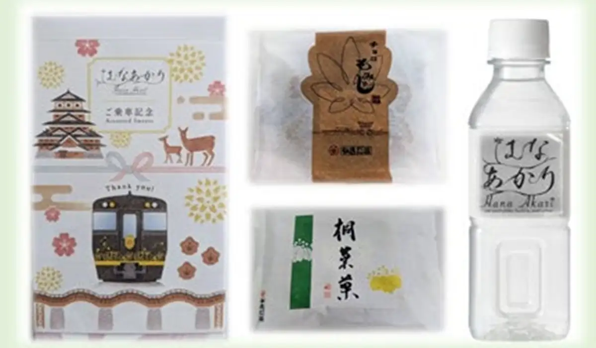 宮島の老舗菓子店・やまだ屋の「もみじ饅頭(チョコもみじ)」と「桐葉菓(とうようか)」を、本運行限定の「はなあかり」オリジナルパッケージで用意。 飲み物とともに、車内で広島名物が楽しめます。