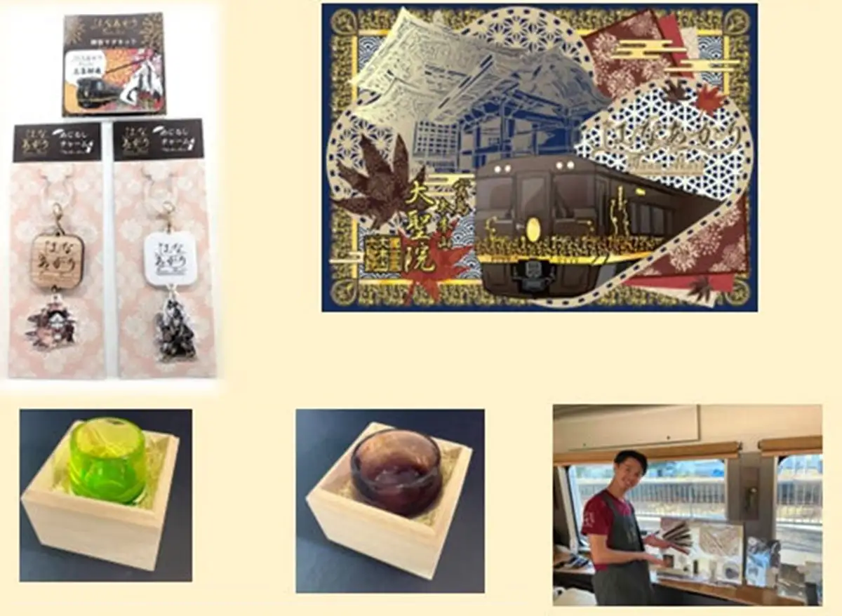 クラフトビールなど地域ならではのお土産や飲料をはじめ、オマージュグラスなどの「はなあかりグッズ」、ひろしま神楽とのコラボ商品、「宮島 大聖院」とコラボしたオリジナル切り絵など、アテンダント3名が乗車してさまざまなアイテムを販売。