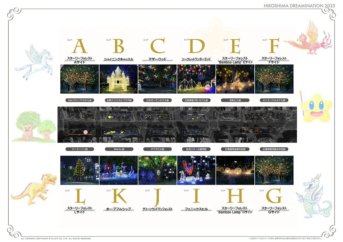 平和大通りをメイン会場として、市内中心部各所で約100万球のイルミネーションが展開される広島最大級のライトアップ事業。「おとぎの国」をテーマにしており、毎年メルヘンチックな世界観を演出。