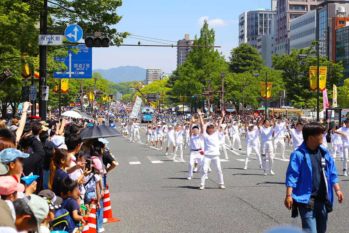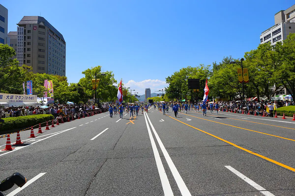 例年約90団体・約5,000人による団体が参加して、平和大通りの田中町交差点〜西平和大橋まで約1.2kmを華やかにパレードします。