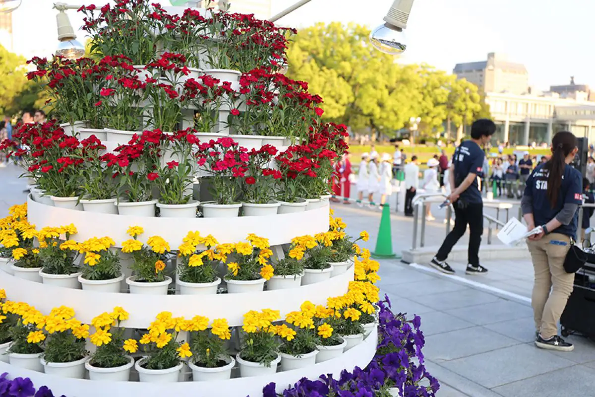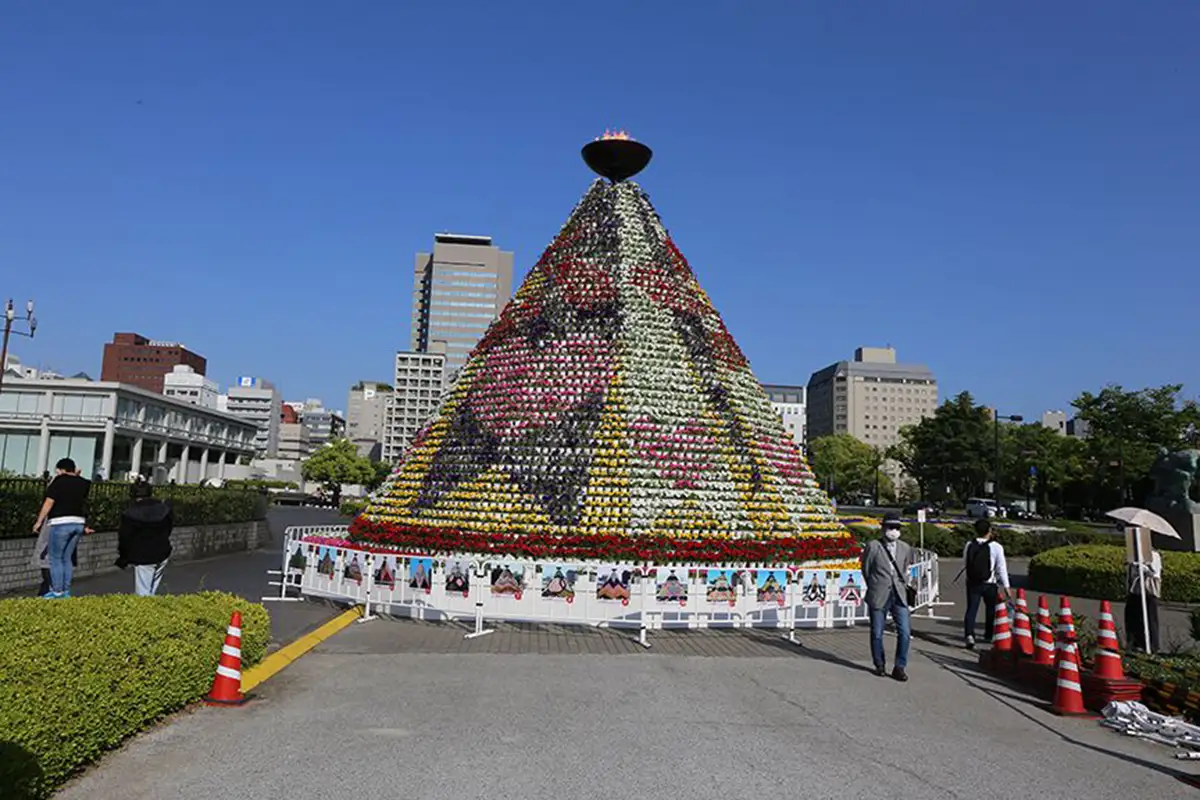 約8000鉢の花で造るフラワーフェスティバルのシンボル「花の塔」が、今年も平和記念公園南側の噴水近くに登場。塔のてっぺんには「平和の灯(へいわのともしび)から採火される火が灯ります。