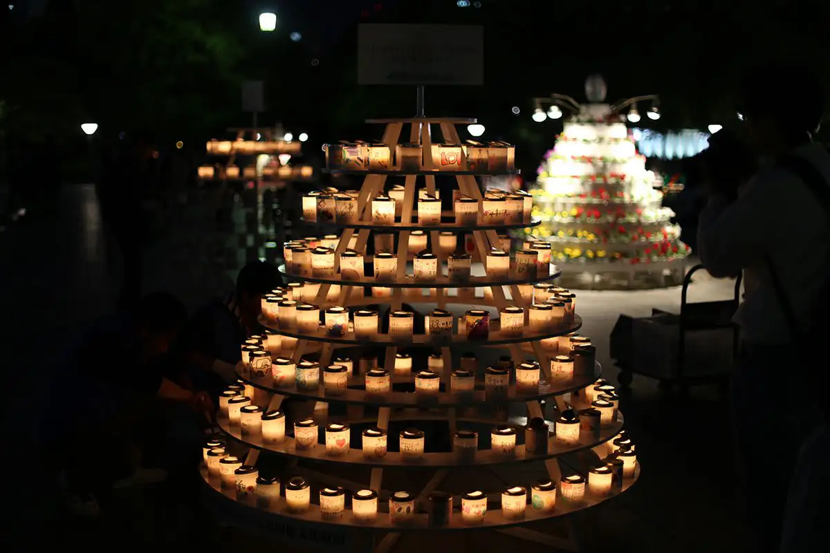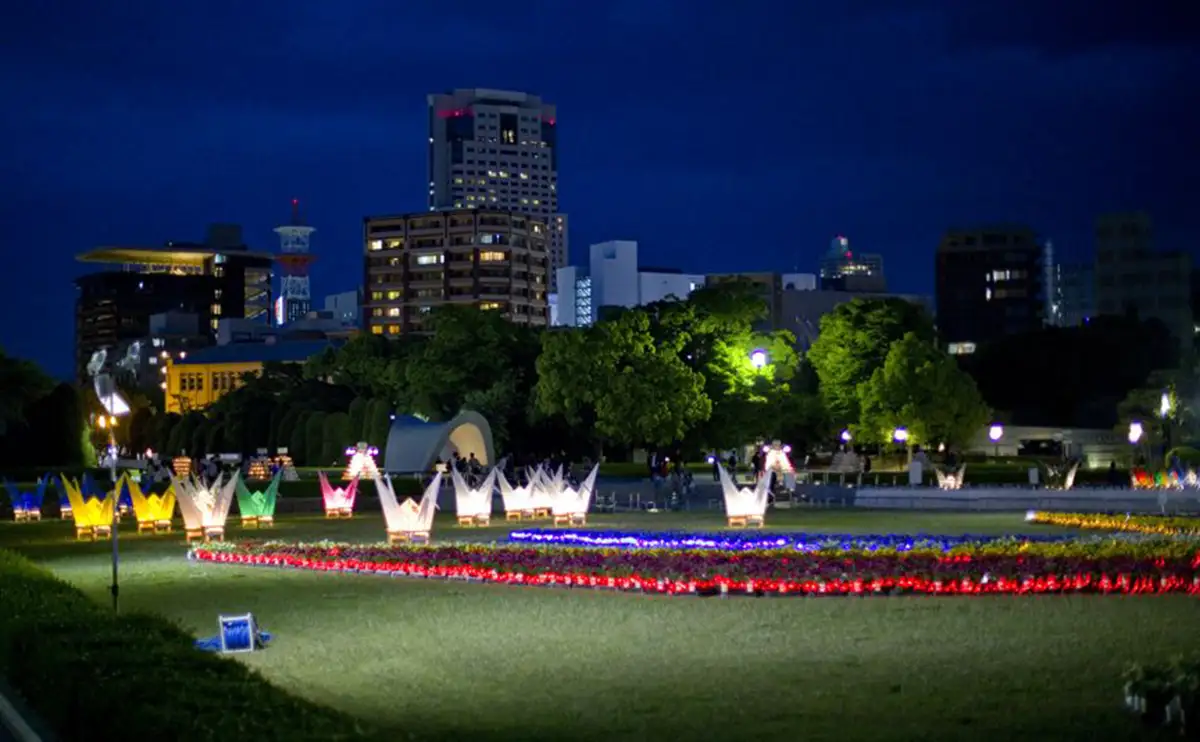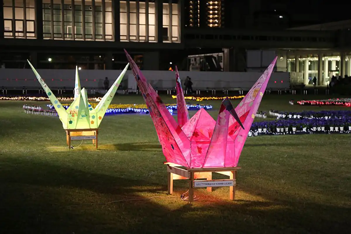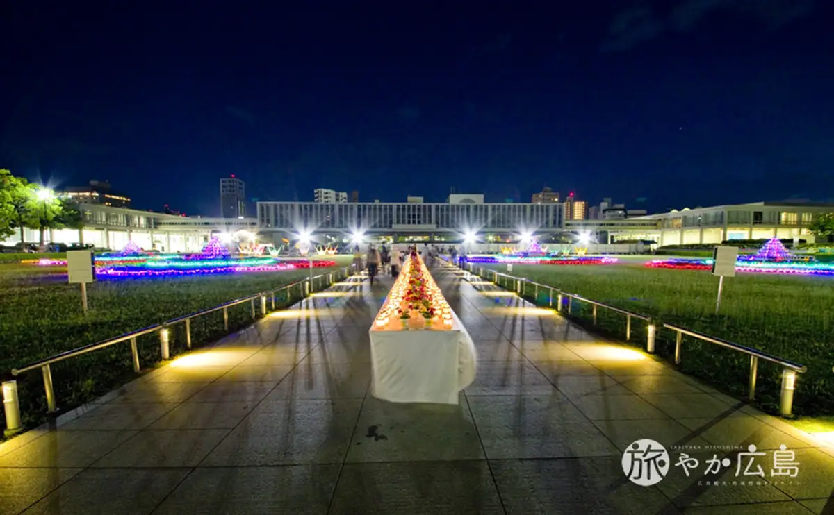 平和記念公園の芝生ひろばやその周辺では、例年18時〜21時までキャンドルやオブジェがライトアップされ、幻想的な空間が広がります。イベント中の3日間は平和資料館の開館時間が延長される予定で、東館と本館を結ぶ渡り廊下からライトアップされた景色を観ることが出来ます。