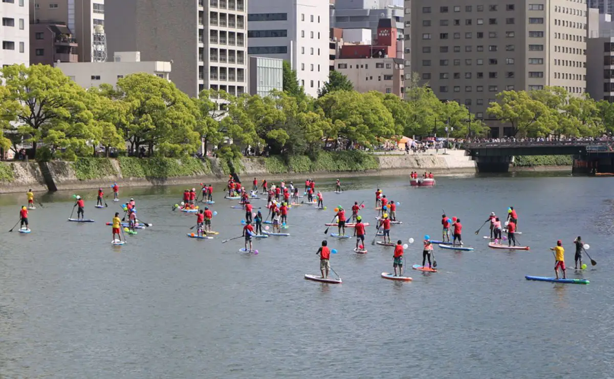 平和記念公園を流れる元安川にて、スタンドアップパドルボード(SUP)のデモンストレーションを開催。