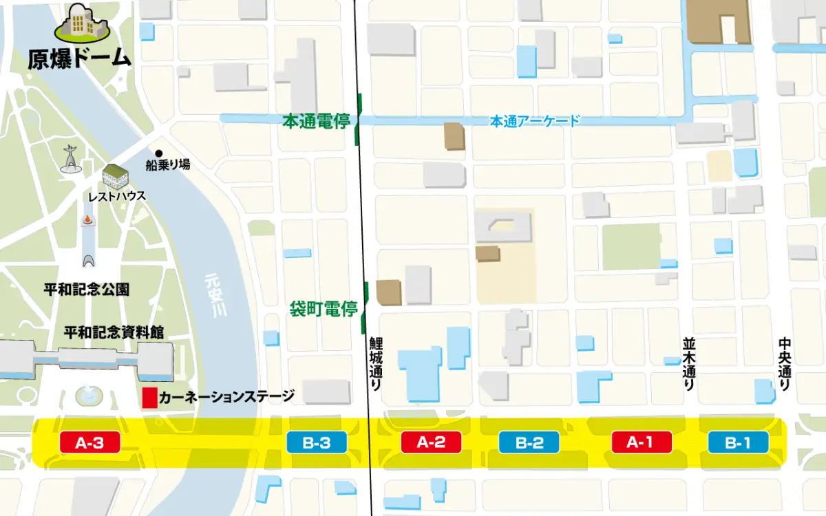 平和大通りの会場を6つのエリアに分けてパフォーマンスが披露されます。