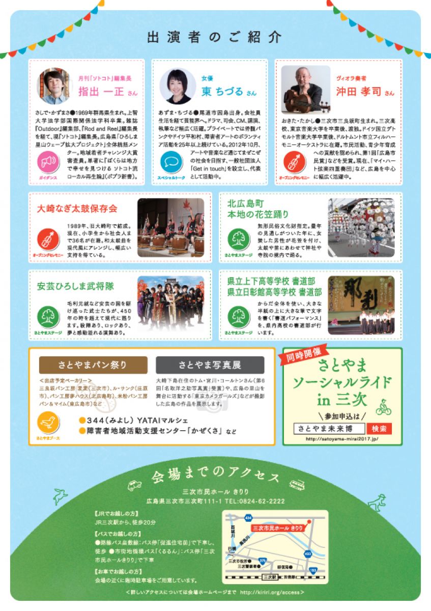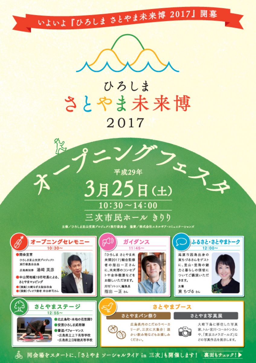 広島の里山にある魅力や活力を全国に伝えるため、長期にわたり様々なプロジェクトを用意。そのスタートを飾るオープニングイベントの開催です。