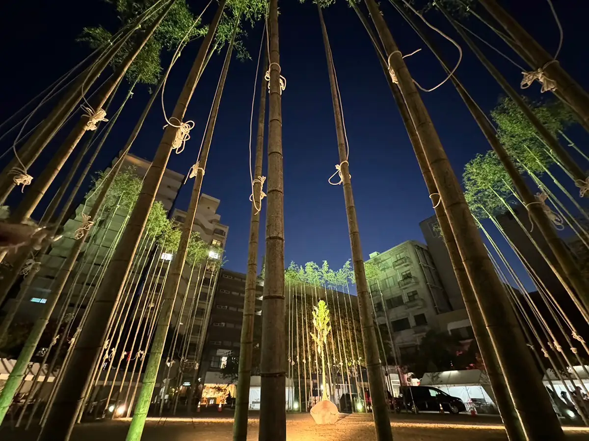 長さ13mの竹(孟宗竹:もうそうちく)88本を直径20mの円周上にぐるりと立て、中央に置かれた1.5tの大石と竹の先端をロープで結びます。すると竹の張力のみで大石が空中に吊り上げられます。