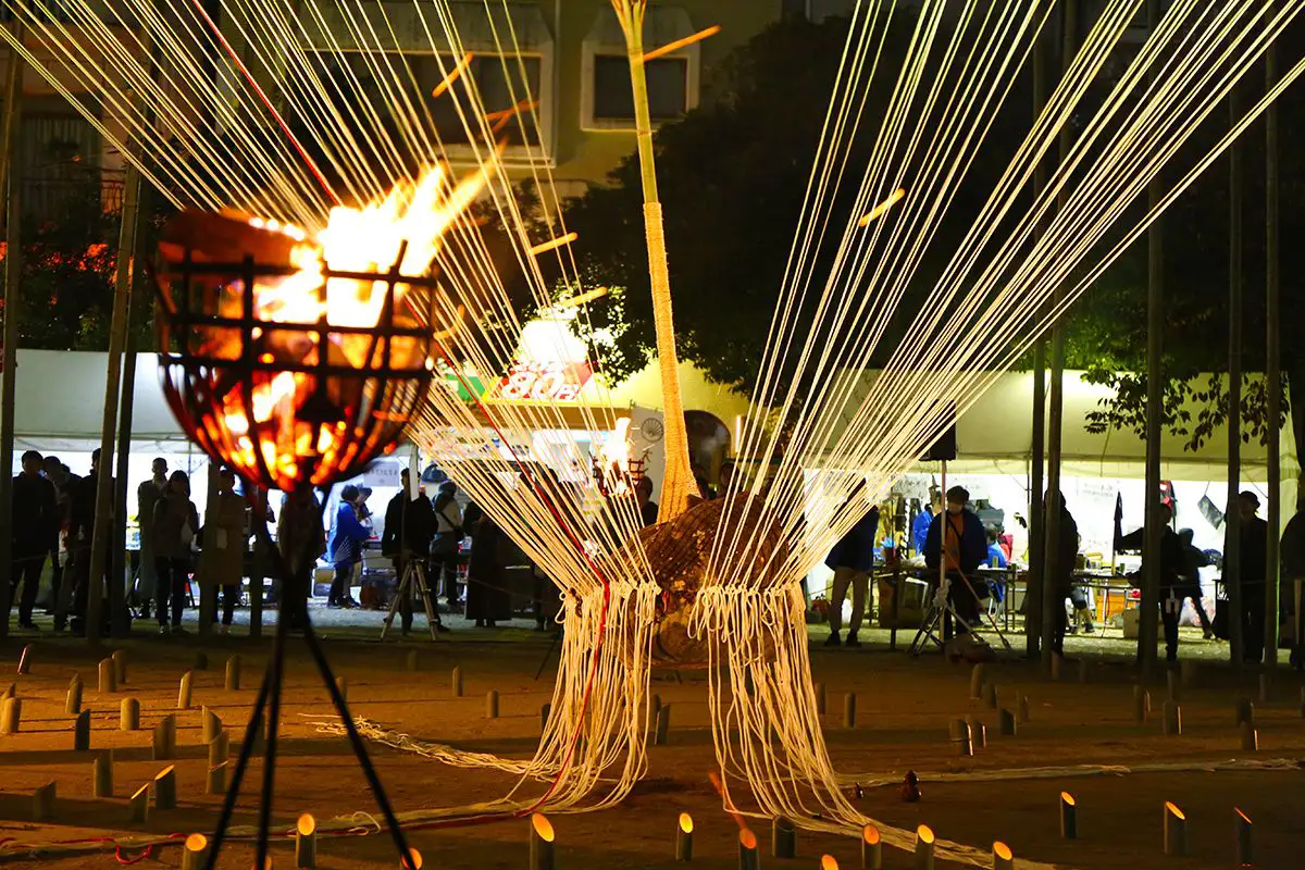 会場となる袋町公園の中央に、この「イノコインスタレーション:石動(いするぎ)」が作られ、吊り上がった大石を「亥の子石」とみたて、「いのこ、いのこ、いのこもちついて 繁盛せぃ、繁盛せぃ」と歌いながら大地をつく「大イノコ」を行います。