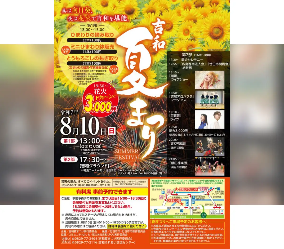 満開のひまわり畑を楽しむ第1部、ステージイベントと花火大会の第2部で構成される、吉和の夏の風物詩。