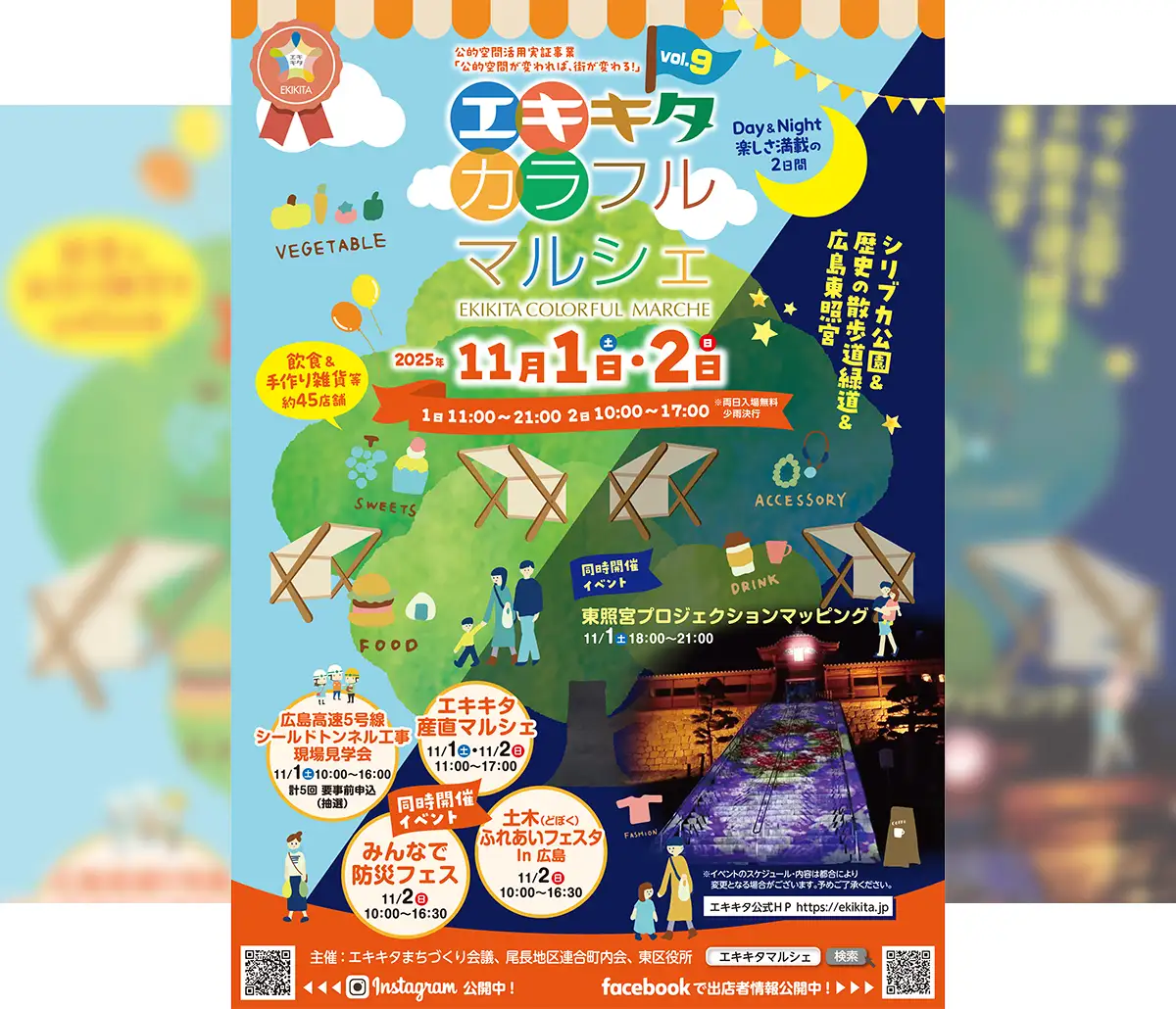 広島駅のエキキタエリアにある公園や遊歩道をマルシェ会場にして、今年もカラフルなお店約45店舗が大集合!