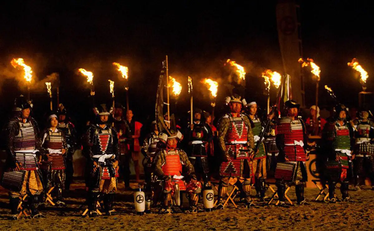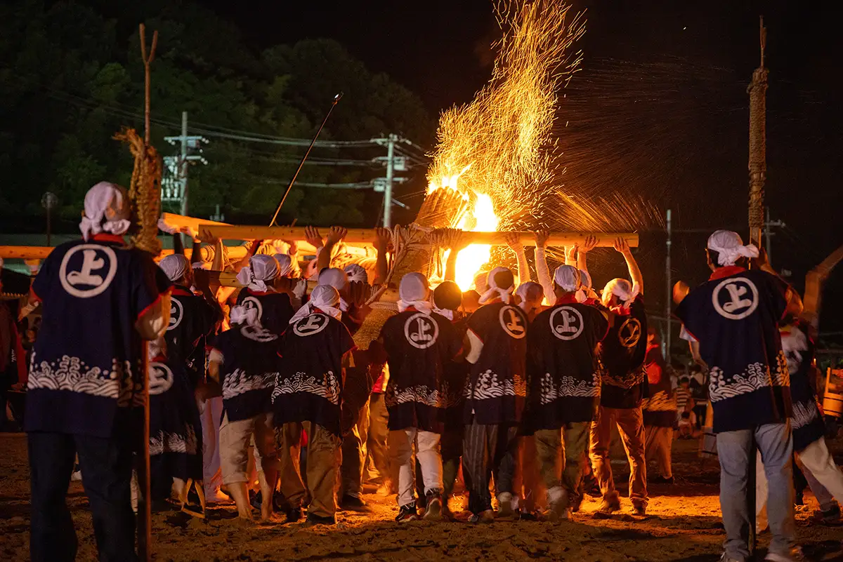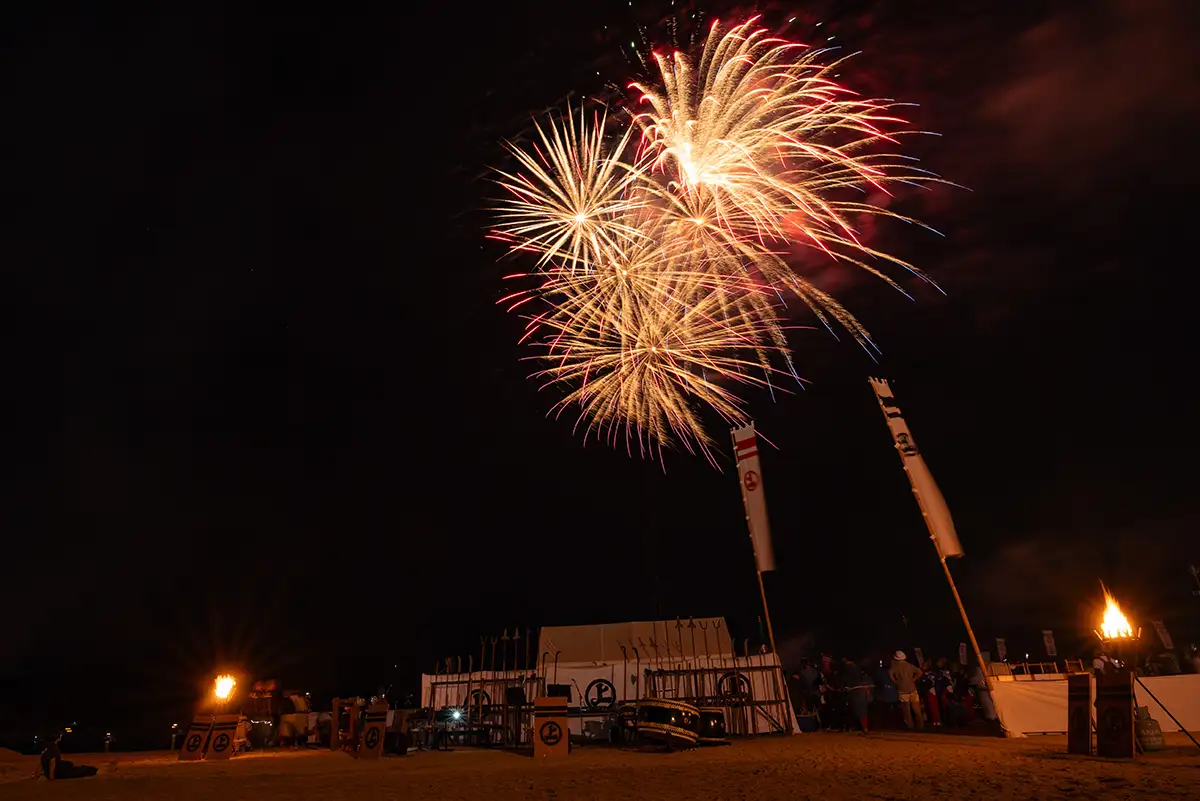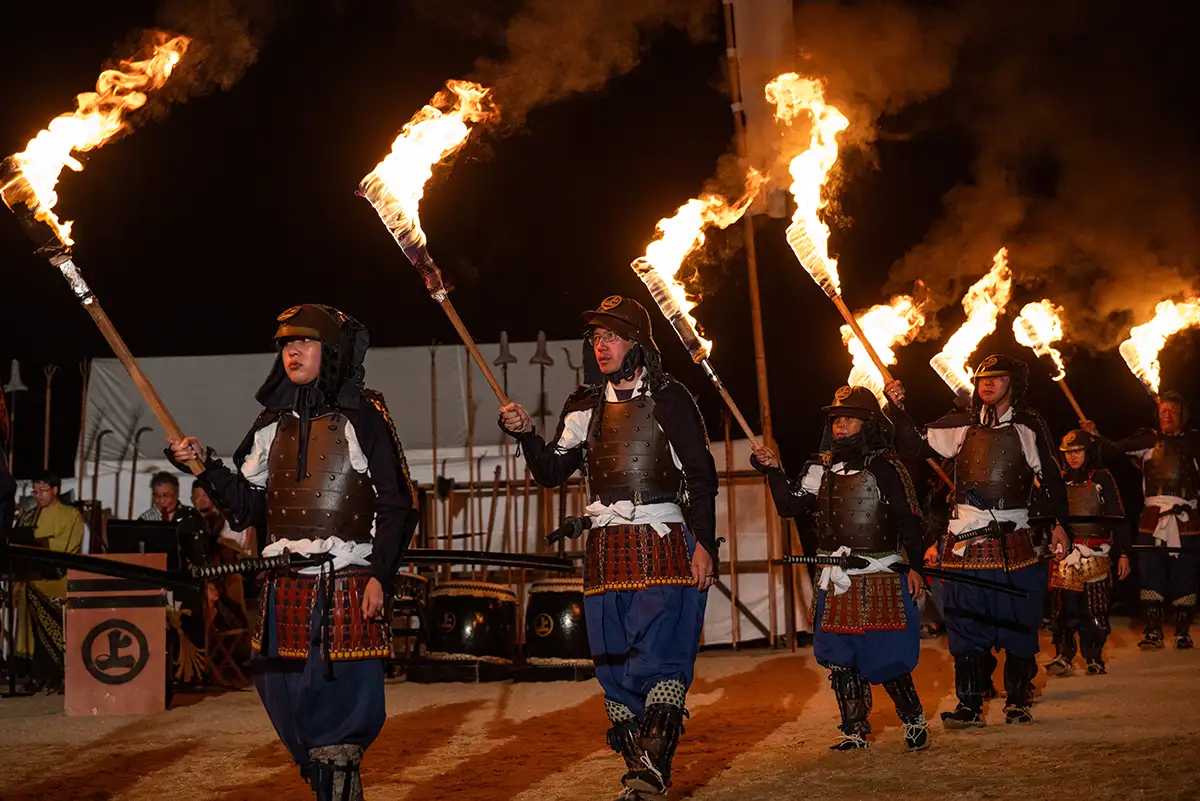 夜の砂浜に水軍まつりの三本柱「水軍跳楽舞(ちょうらくまい)」、「鎧武者」、「小早」が集結。松明の明かりと共に甲冑姿の小早隊が入陣する姿は圧巻。クライマックスには音楽と花火がコラボした大筒花火が打ち上がり、祭りの幕を閉じます。