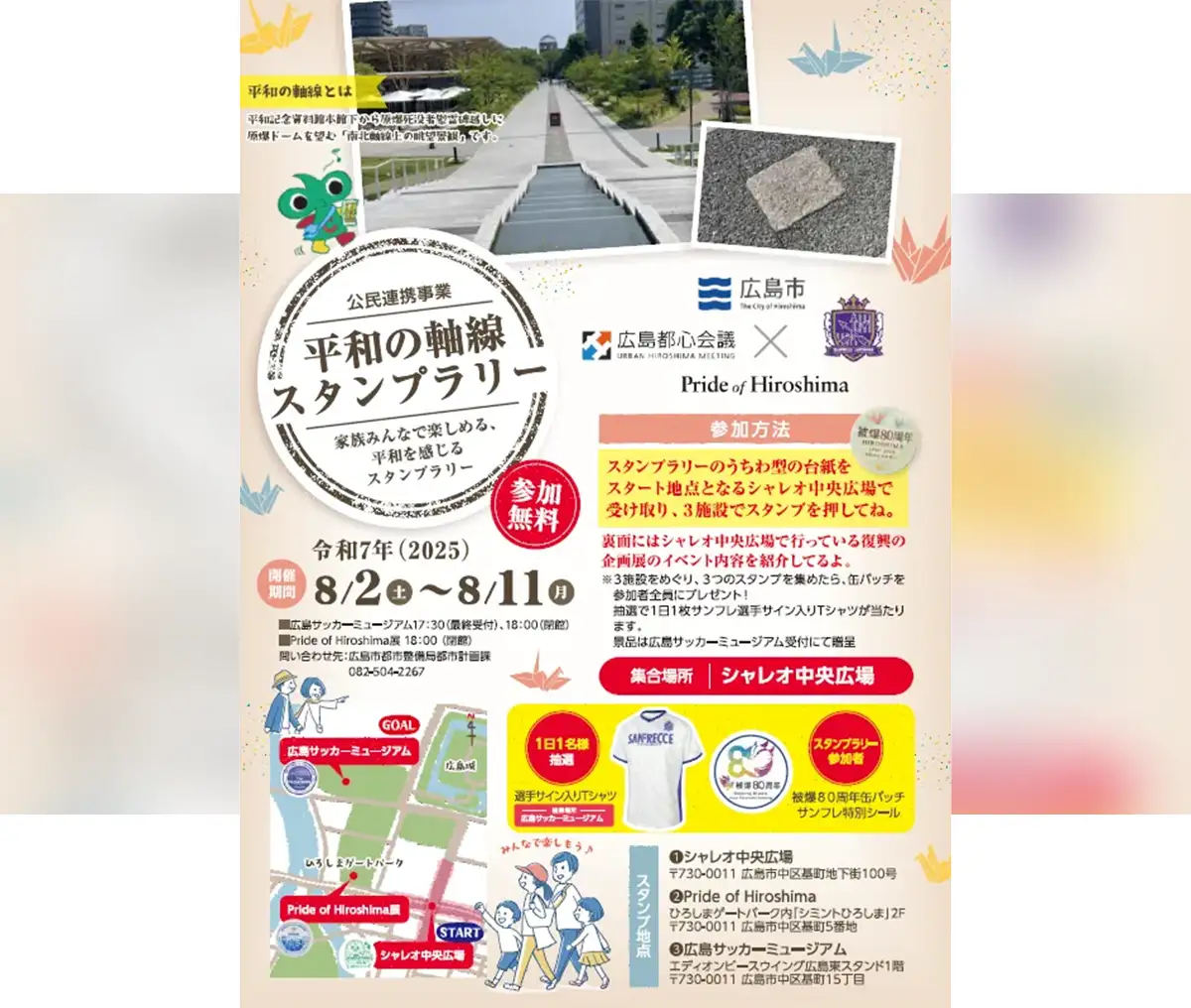 平和を感じながら、家族みんなで楽しめるスタンプラリーを開催。被爆80周年記念事業を開催する3施設を巡り、3つのスタンプを集めたら参加者全員に「被爆80周年間バッチ サンフレ特別シール」をプレゼント。さらに、1日1名にサンフレ選手のサイン入りTシャツが当たります。