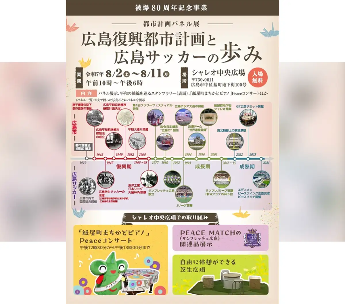 シャレオ中央広場にて、被爆後の広島復興都市計画と広島サッカーの歩みをパネル展示にて紹介。