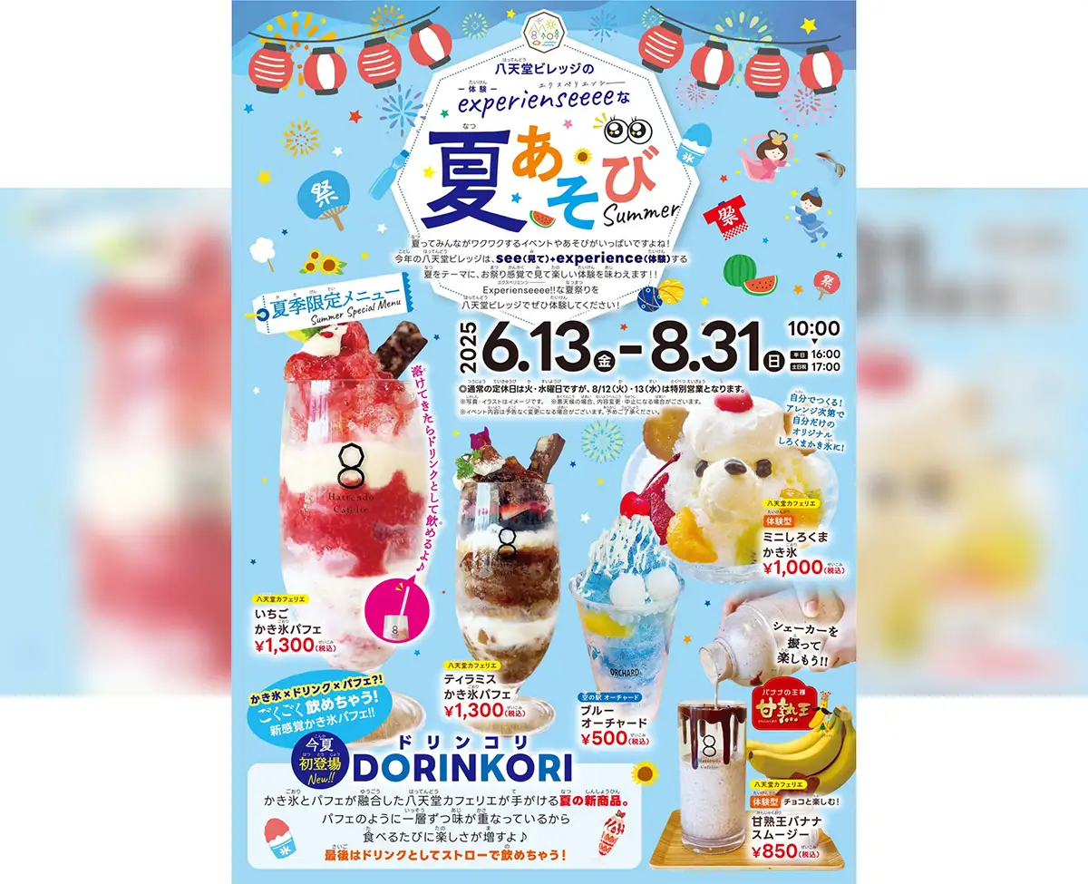 新感覚スイーツや縁日、夏休みの自由研究にもぴったりな体験プログラムなど、見て・食べて・体験して楽しめる八天堂ビレッジの夏イベント。