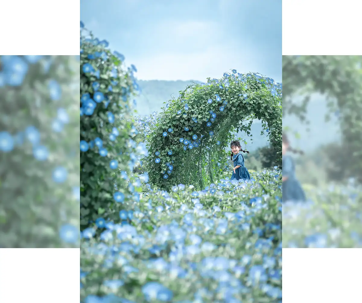 ヘブンリーブルー(西洋アサガオ)の立体植栽。爽やかなブルーがトンネルを覆いつくし、中には木漏れ日が差し込んでなんとも夏らしいフォトスポットが誕生。