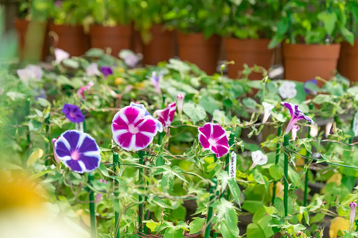 「Flower village 花夢の里」で育てた朝顔の花鉢を販売。様々な種類の朝顔を取り揃えています。
