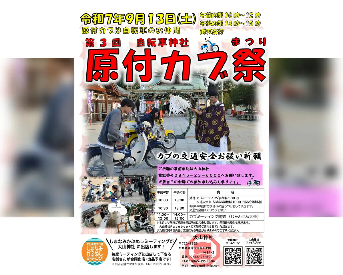 日本唯一と言われる[自転車神社]にて、「原付カブ(原動機付自転車)」をテーマにした祭り。交通安全祈願とライダー同士の交流が楽しめる!