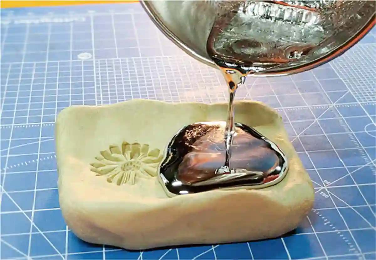 ねんどで型を作り、IHヒーターで溶かした金属(錫)を流し込む体験!自分だけのオリジナル金属アイテムをその場で作れます。