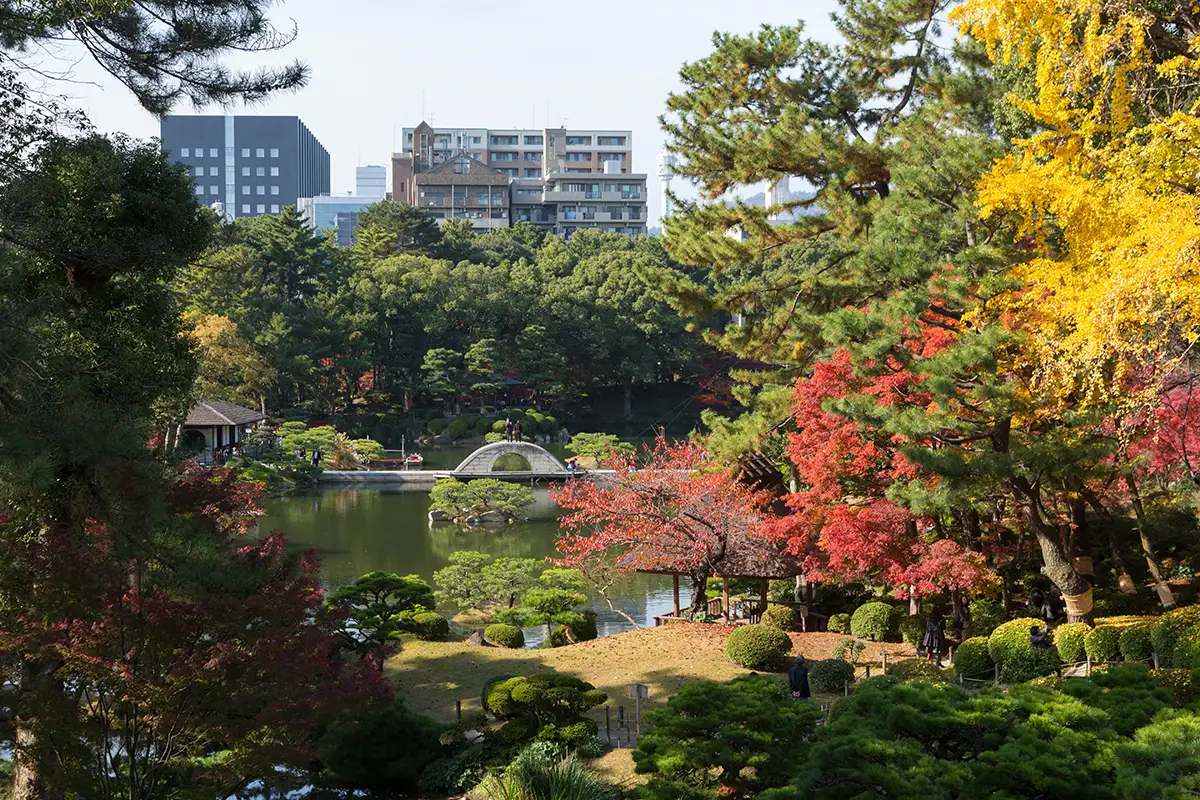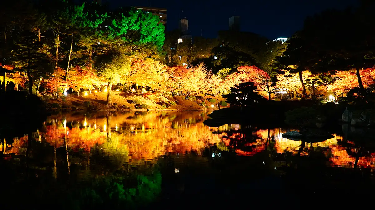 日本庭園の名勝・縮景園で紅葉狩りイベントを開催。日没後には紅葉ライトアップも実施。