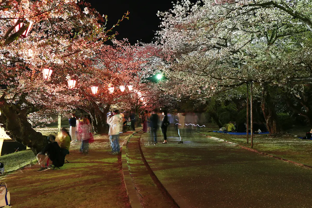 さまざまなカラーにライトアップされる錦帯橋と夜桜観賞が楽しめるこの時期だけの特別な幻想的風景です。