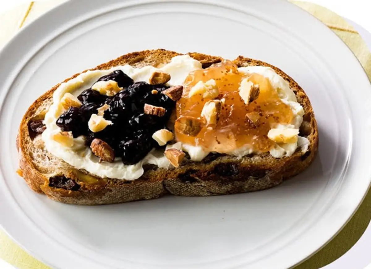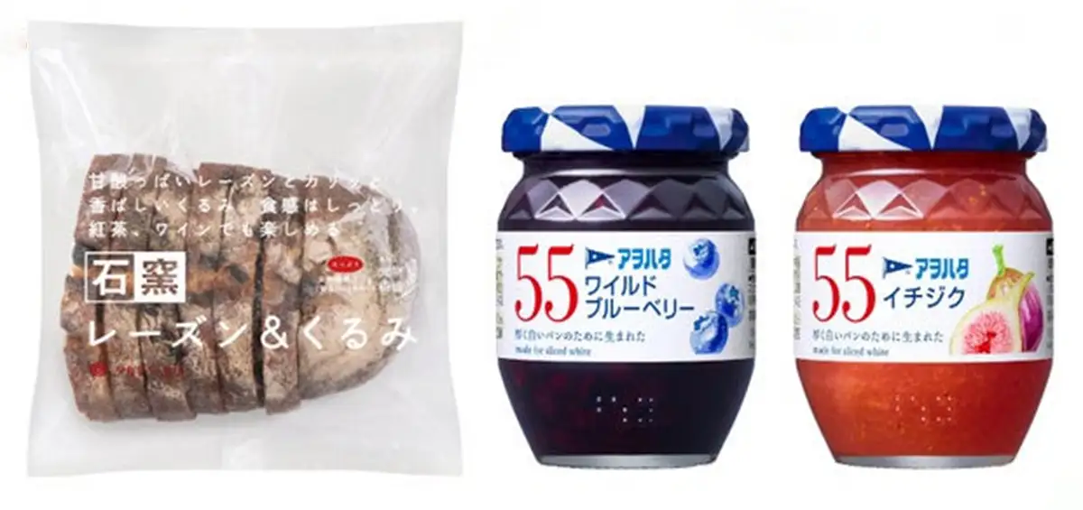「石窯レーズン&くるみ」に2種類のジャムとナッツを添え、香ばしいパンとフルーツの甘みが楽しめます。