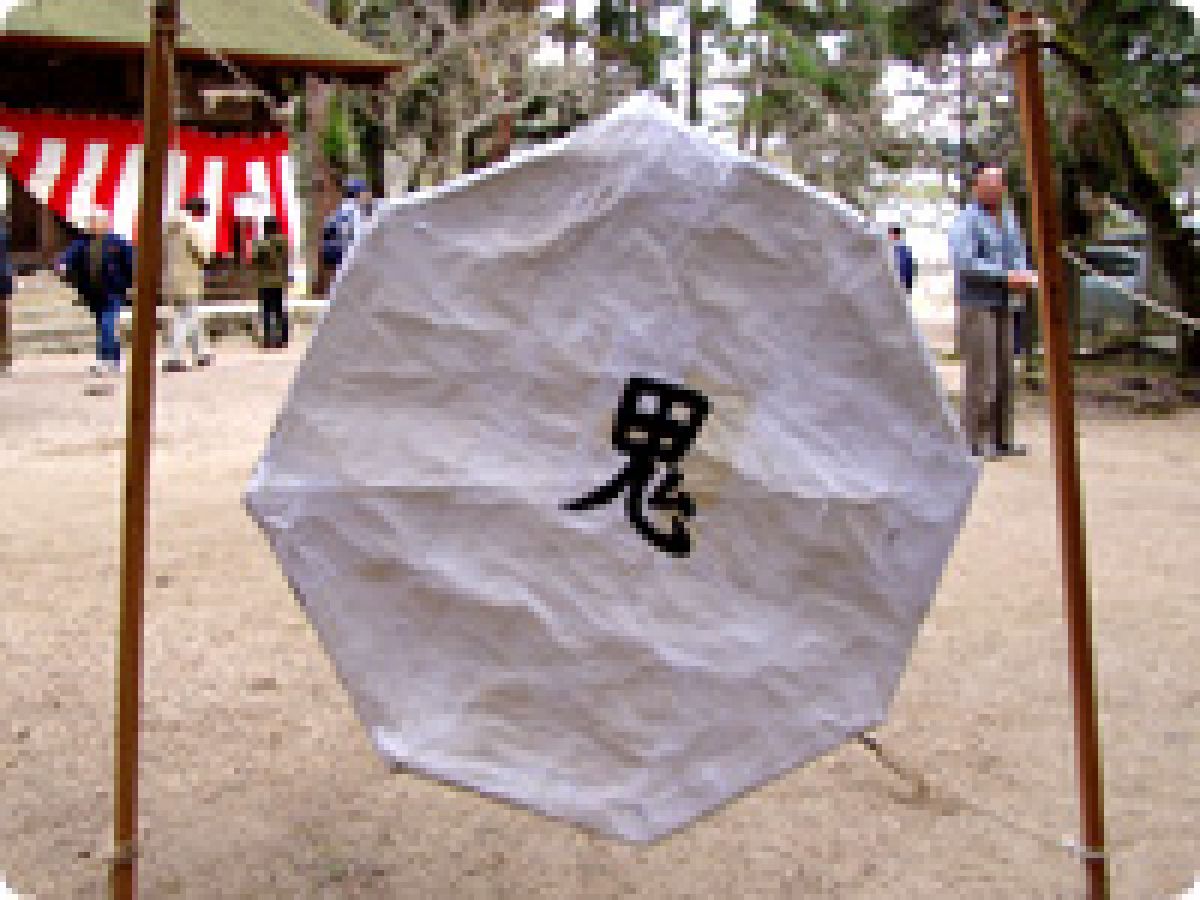 年の始めに争いごとはしないという意味を込めて矢を射る宮島の恒例行事。的の裏には甲・乙・ム(こう・おつ・なし)の3文字を組み合わせた謎字が書かれてあり、これが争いごとをしないという意味を持っています。