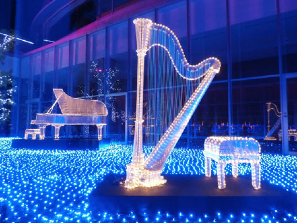 館内の中庭には一面青色に染まるいるミネーション。その中にグランドピアノとハーブのオブジェが輝いています。