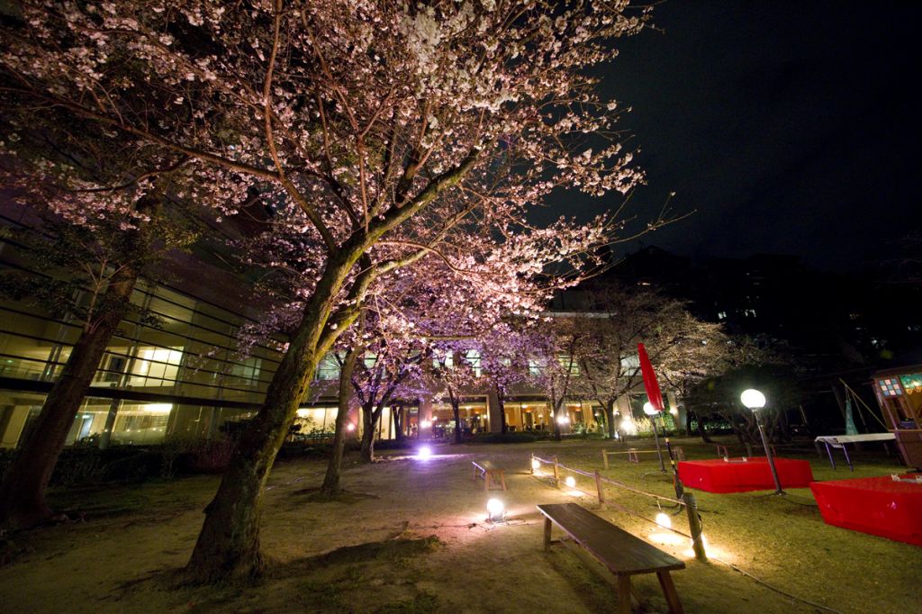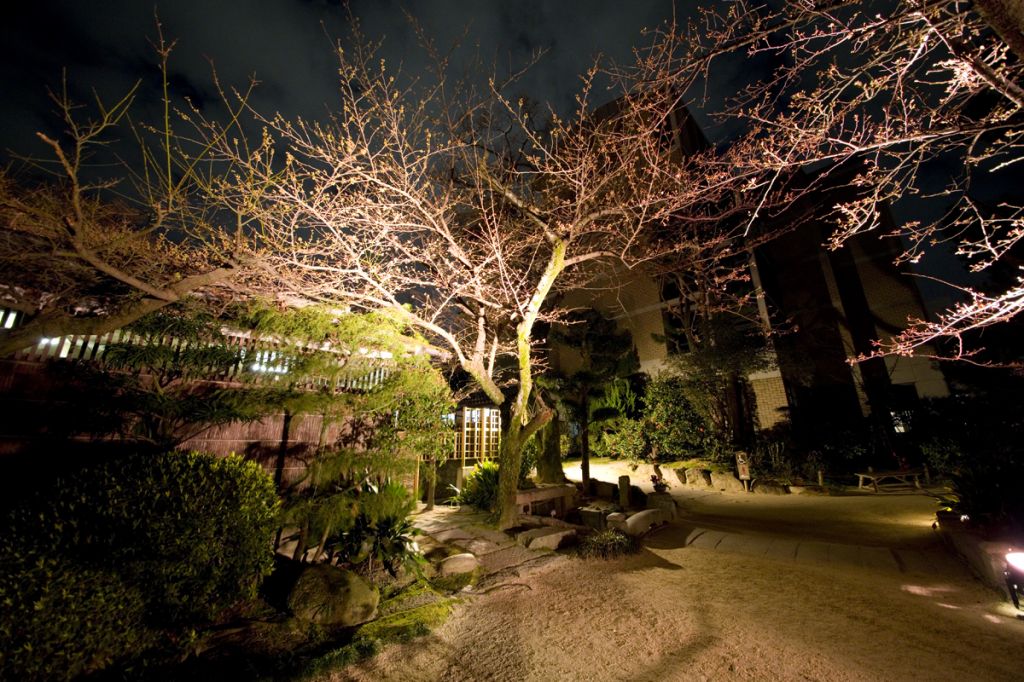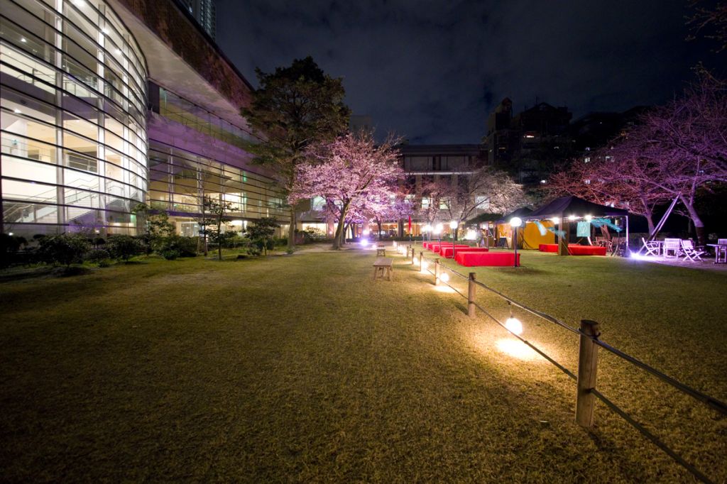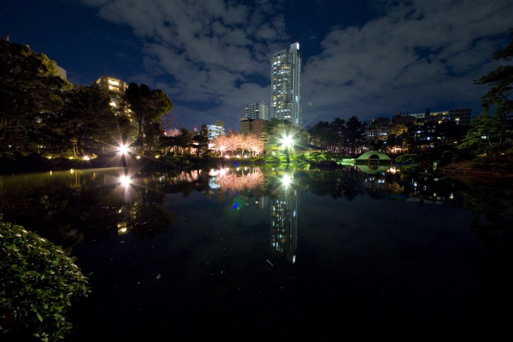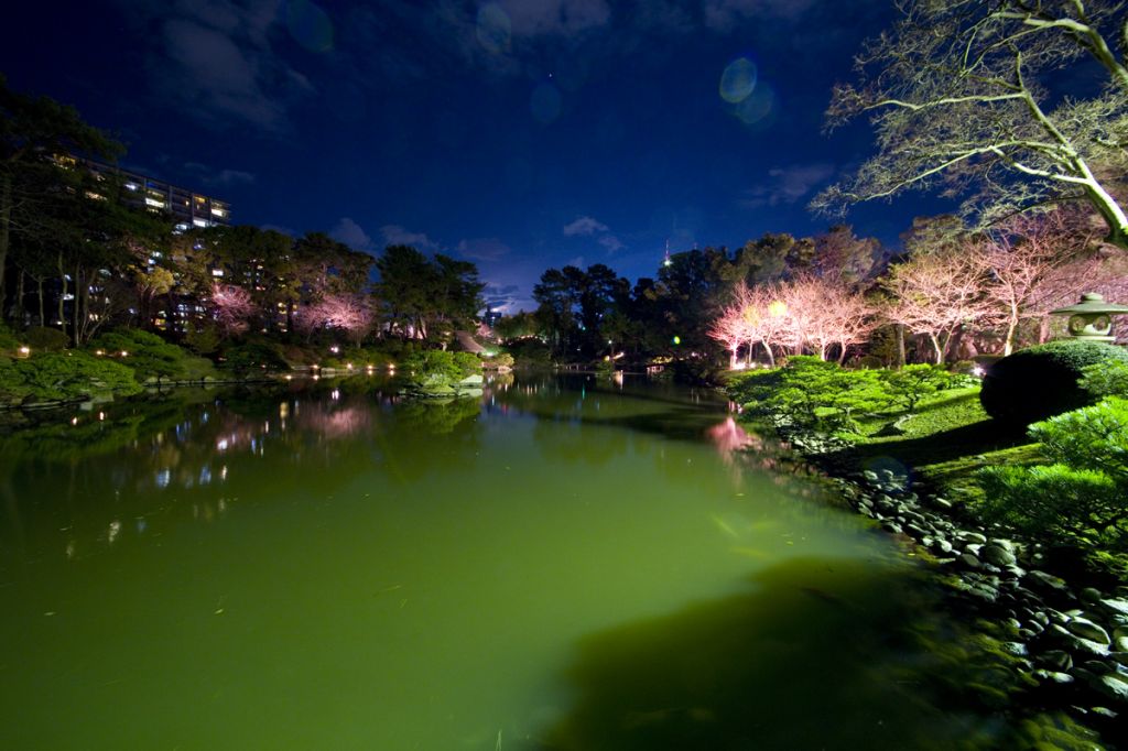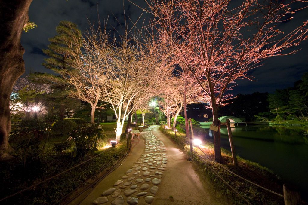 夜桜の特別開園時は、照明設備のない園路は立ち入り禁止ゾーンとなっており、美術館前芝生広場、清風館前芝生広場、迎暉峰(げいきほう)周辺でライトアップされた園内を歩いて回れます。