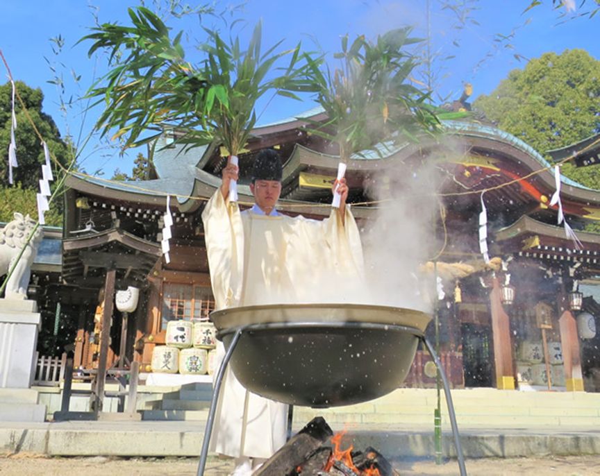 天皇陛下の御在位三十年と御代替りを記念して再興。神前に設置された大釜の熱湯へ笹の葉をひたし、社殿と参列者に振りかける儀式。熱湯は古くから厄災を浄め祓う力があるとされています。参拝者には、「御久米(おくま)」と呼ばれるお米が配布されます。