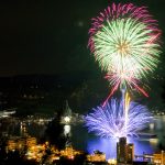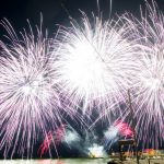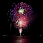しまなみ海道の途中にある因島で、夏の夜空を彩る花火大会。瀬戸内海をバックにして花火が打ち上げられます。