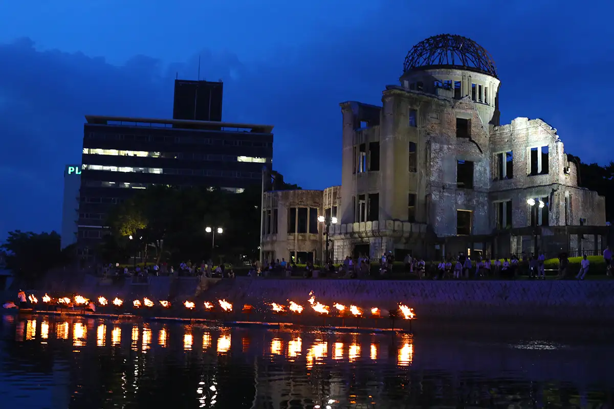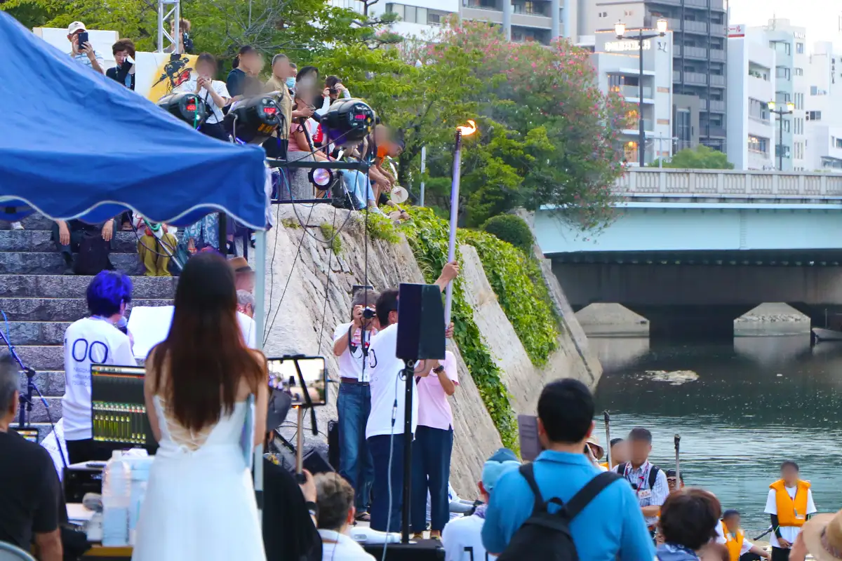 平和記念公園を流れる元安川の原爆ドームたもとで、「かがり灯」に平和への思いを願う祭典。「平和の灯(ともしび)」から火種をもらい、かがり灯に火が移されます。
