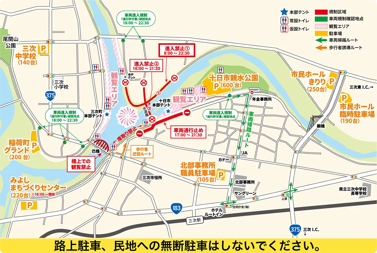 三次を代表する花火大会。河川敷から迫力の花火を間近で観覧。音楽と花火がシンクロする演出など、今年も三次の夜空が美しく彩られる一夜に。