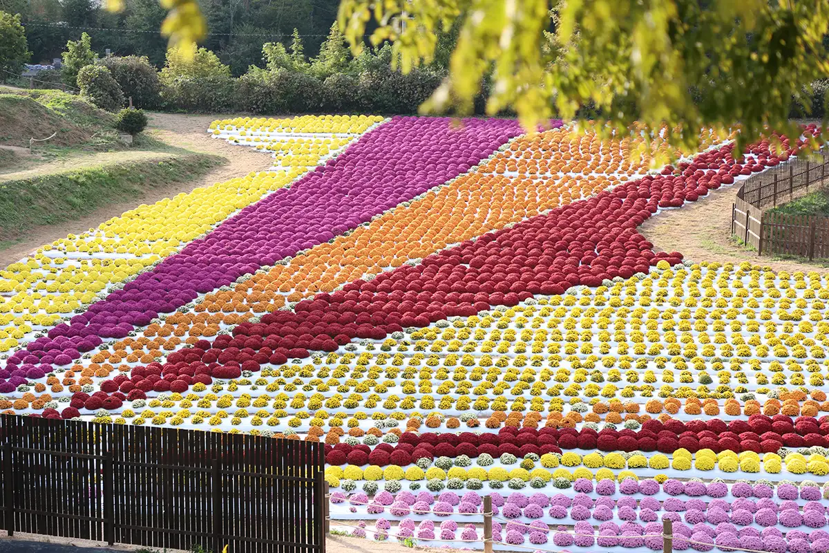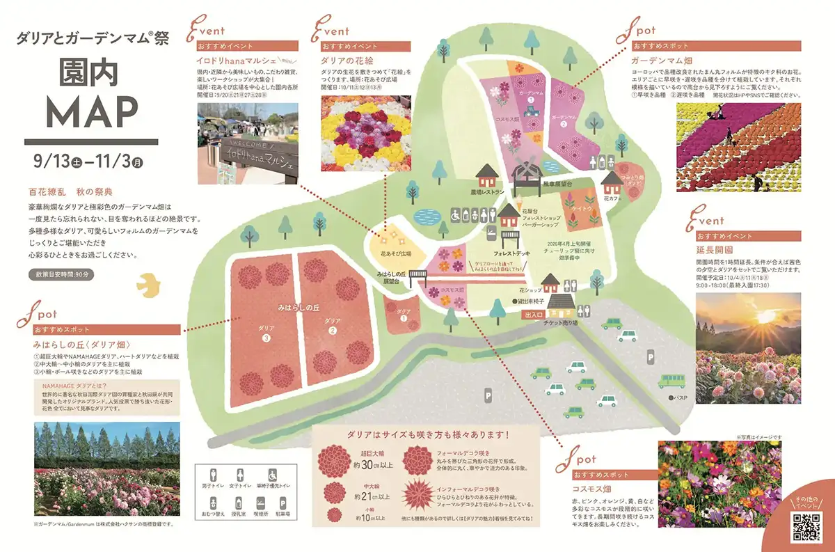 世羅高原農場で色とりどりのダリアと華やかなガーデンマムが織りなす風景が楽しめる、秋の花畑イベント。
