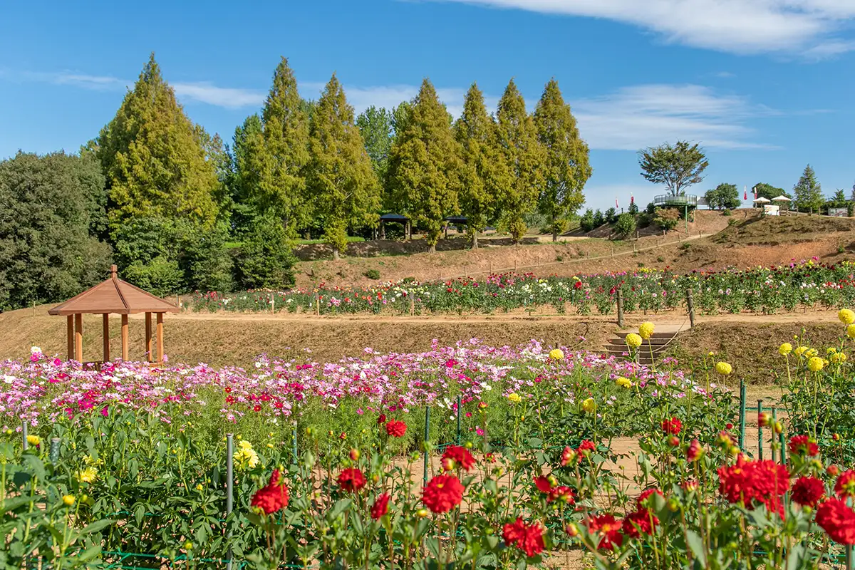 園内の奥には、メタセコイアの木々に包まれた広々とした「みはらしの丘」が広がります。そこでは、小輪でボール咲きのダリアをはじめ、中大輪や超巨大輪のダリアなど、さまざまな種類の花々が植えられています。