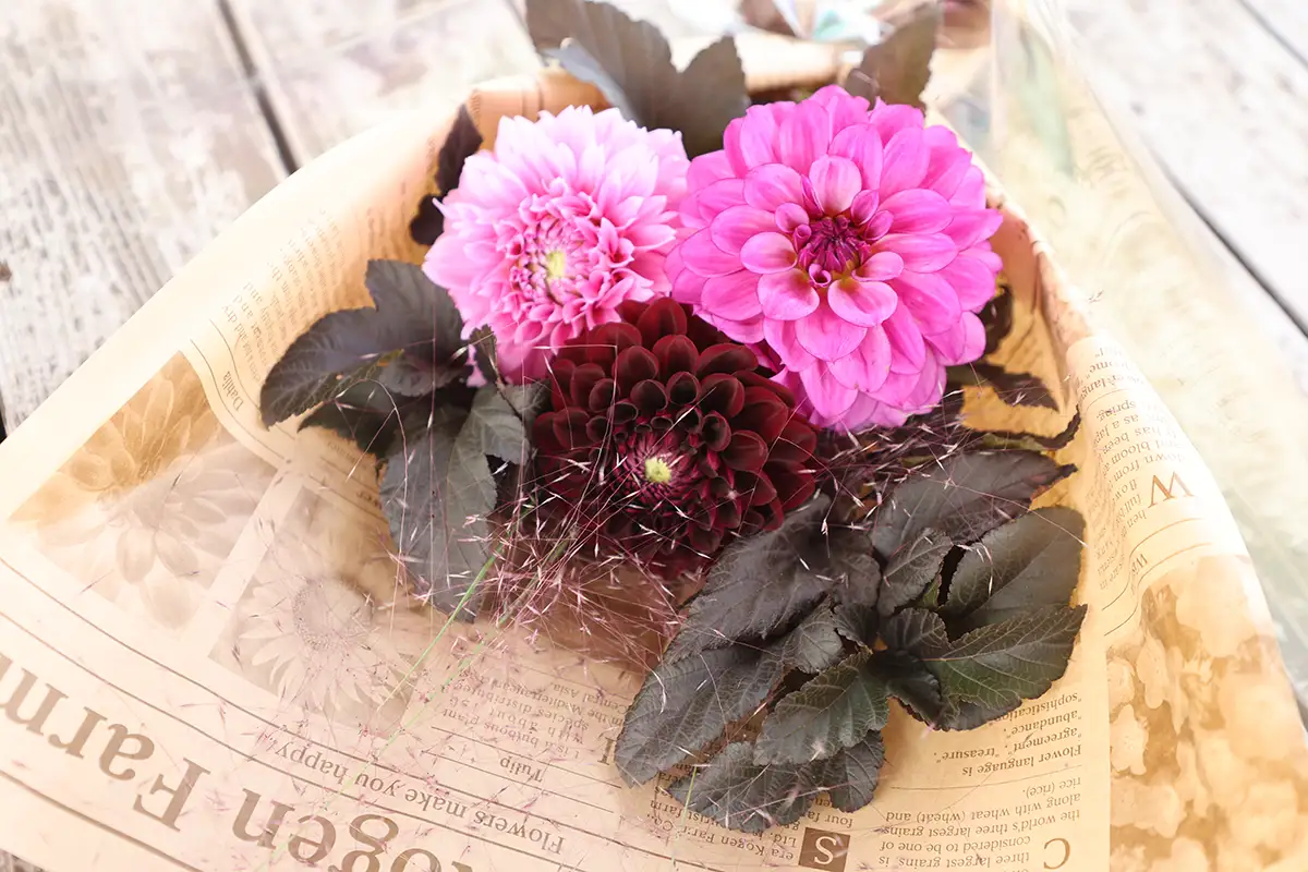自身で好みのダリアを摘みとれる企画。セルフラッピングで花束のように仕上げることも可能。