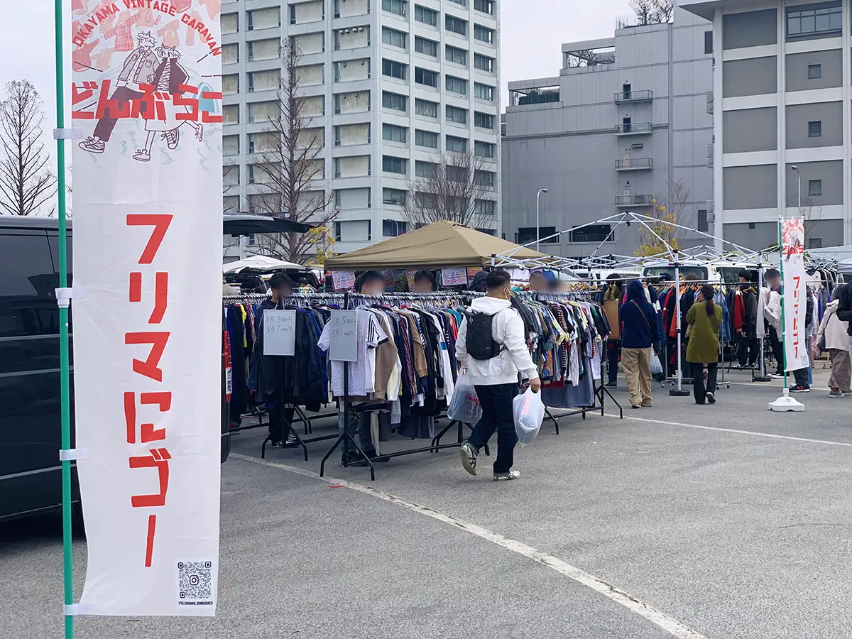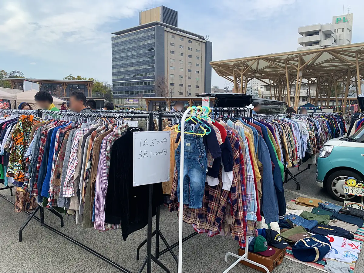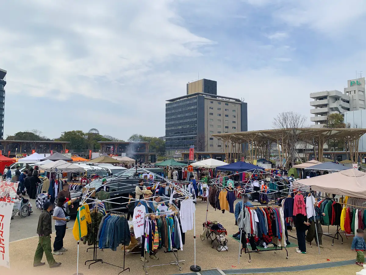 グルメ会場の奥では、岡山発の人気フリーマーケットが広島に初登場しました。広場いっぱいに広がるブースには、古着やアクセサリー、帽子やバッグなどのアイテムが並び、見て回るだけでも時間がかかるほどの充実ぶりです。
