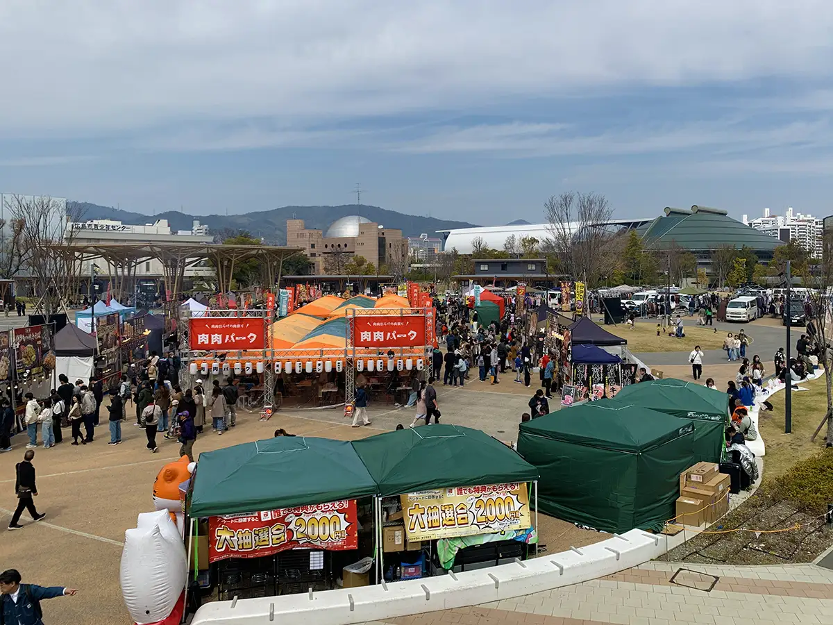広島市中区のひろしまゲートパークで、2026年3月20日(金)に肉グルメが集結するイベント「肉肉パーク」と大型フリーマーケット「出張版どんぶらこ」が同時開催され、会場は朝から多くの来場者で賑わいました。