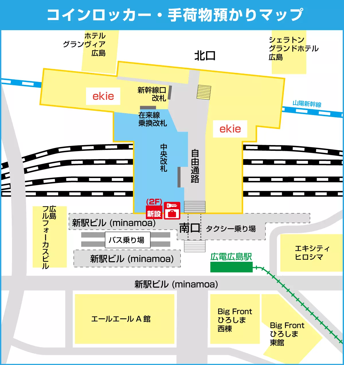 広島駅構内及び周辺のコインロッカーや手荷物預かり所の一覧については、以下リンク先で記事をまとめています。
