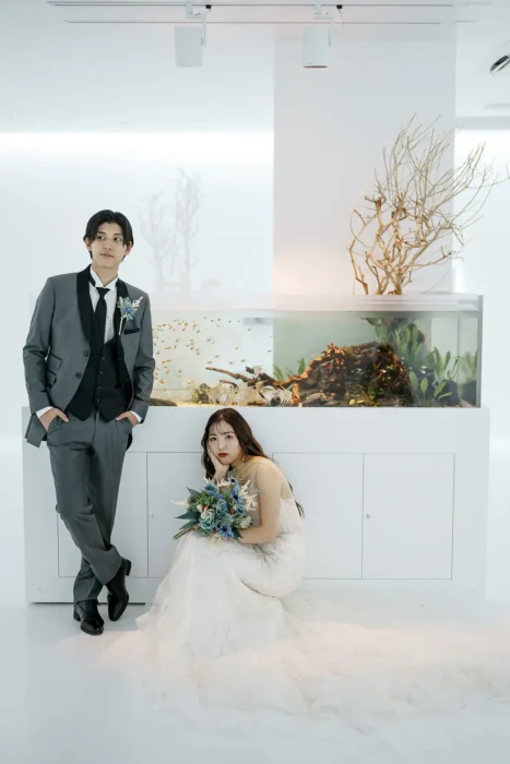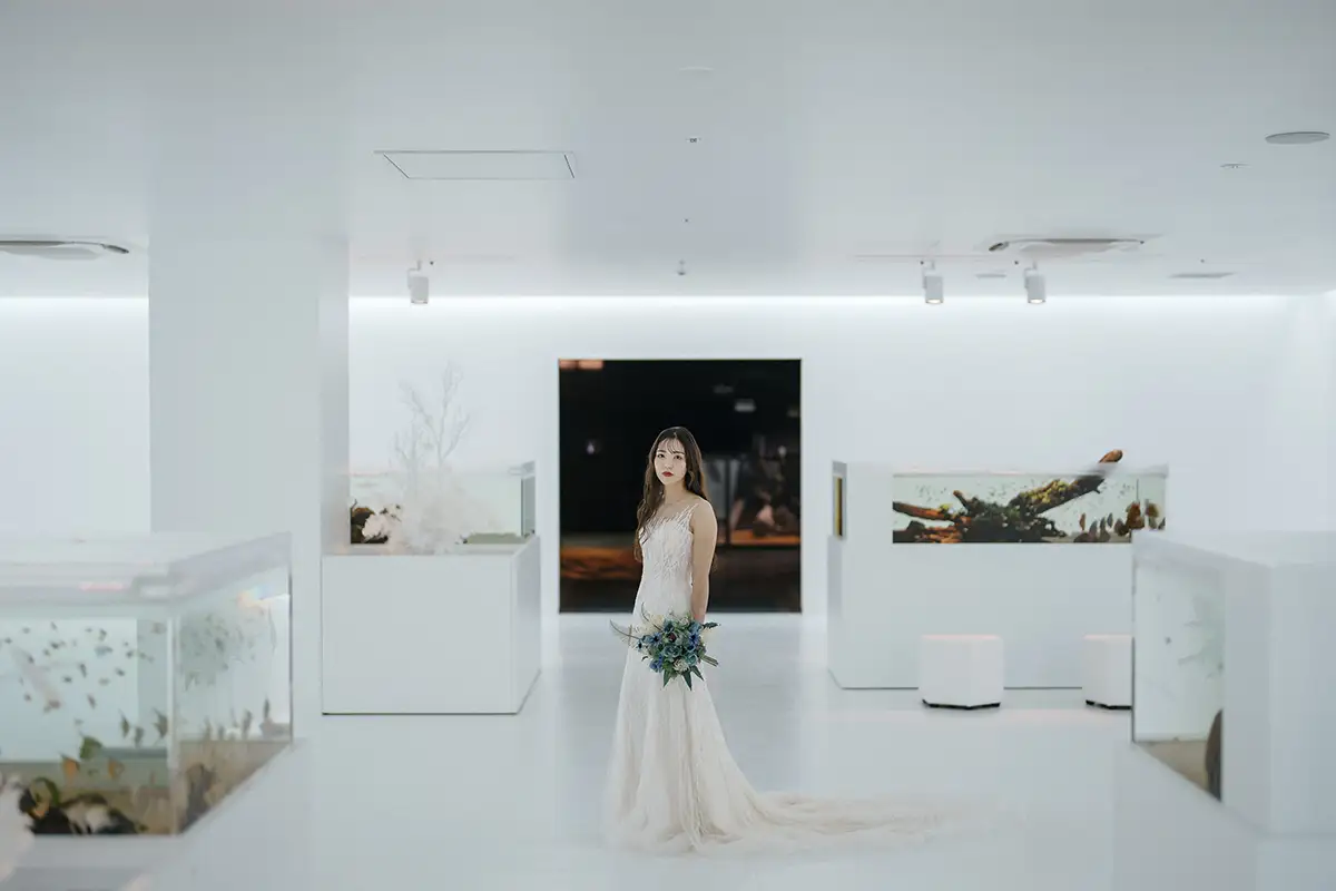 生きものが息づく空間とアートが融合した世界観は広島もとまち水族館ならでは。同プランは、水族館とエルセルモ広島の2会場で撮影を行うことで、幻想性とクラシカルな美しさを併せ持つフォトウェディングを実現します。