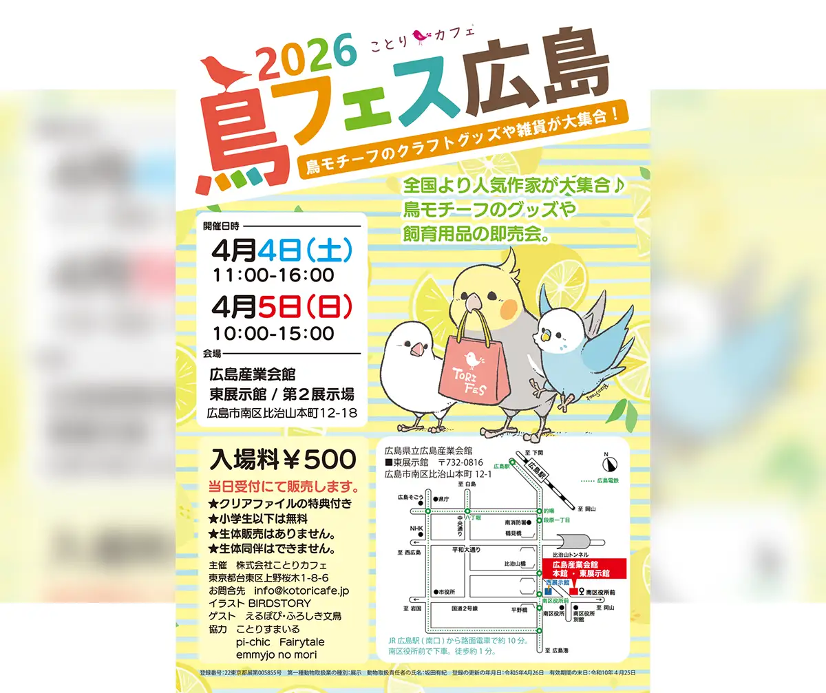 広島市南区にある広島産業会館で、鳥をテーマにした作品やグッズが集まる即売イベント「鳥フェス広島2026」が2026年4月4日(土)と5日(日)の2日間開催されます。