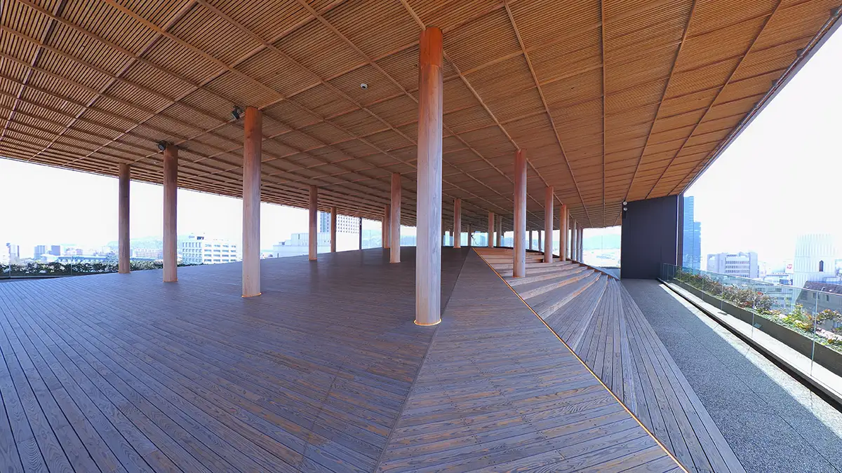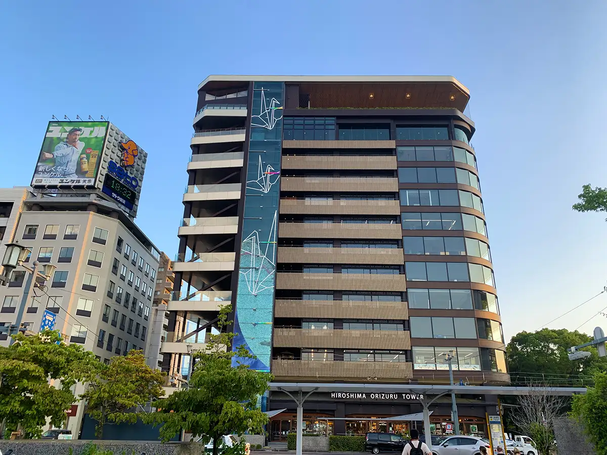 おりづるタワーの屋上展望台は、日中はウッドデッキと木の柱に囲まれた温もりある空間が広がり、訪れる人に安らぎのひとときを提供します。眼下には平和記念公園や原爆ドーム、そして広島の街並みが広がり、時間を忘れてゆったりと景色を楽しめるのが特徴です。