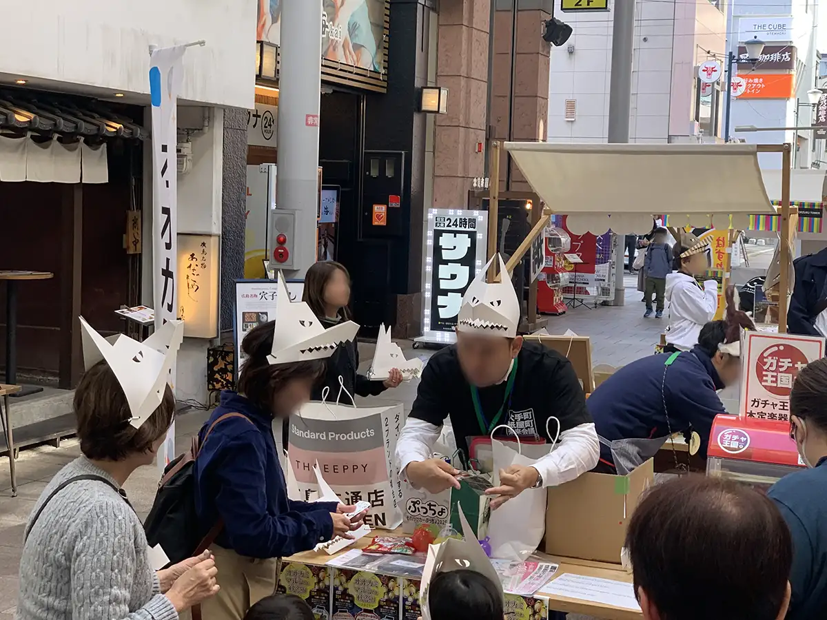 来場者や販売者は紙製の“オオカミのカブト”を頭に身につけ、会場は賑やかな雰囲気に。オオカミカプセルのガチャガチャやオオカミフードフェスなど子どもも大人も楽しめる充実のコンテンツです。