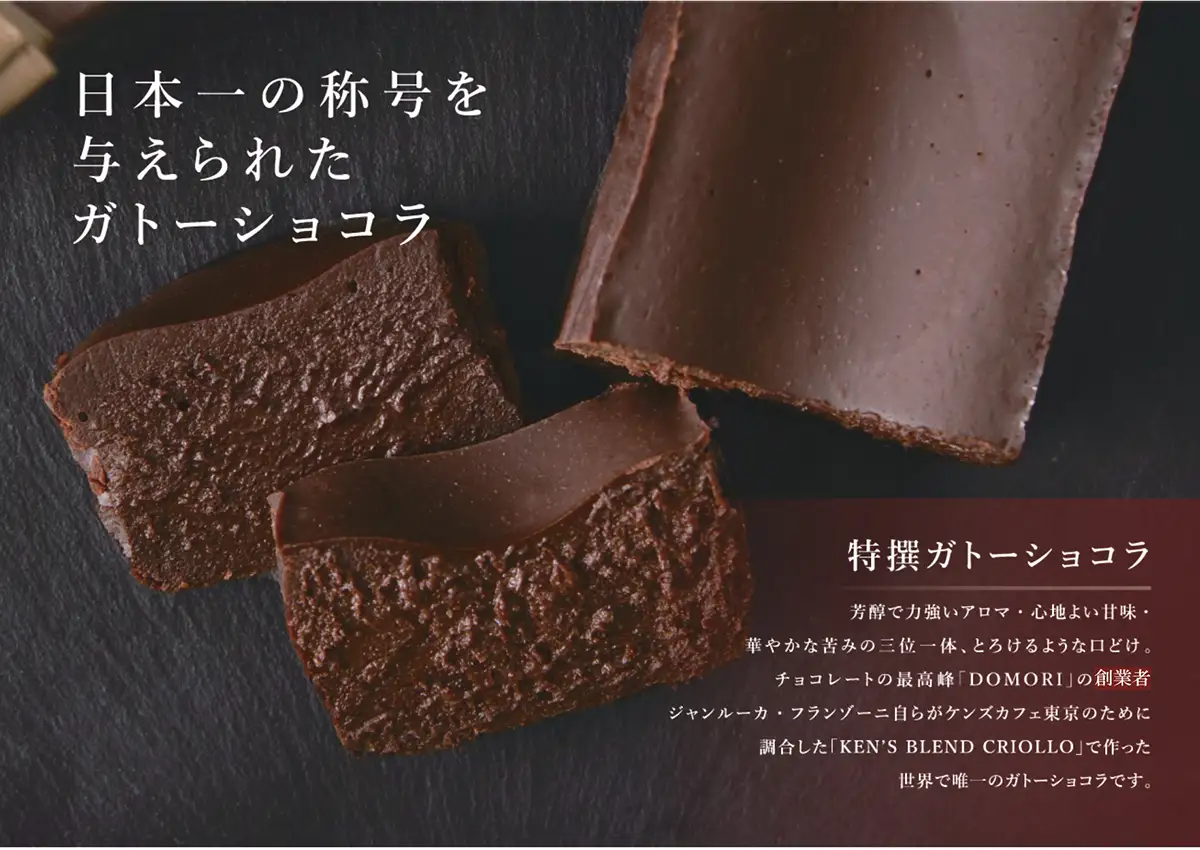 ケンズカフェ東京の代名詞ともいえる「特撰ガトーショコラ」には、世界最高峰のチョコレートブランド「DOMORI」の創業者ジャンルーカ・フランゾーニ氏が、同店のためだけに特別調合した「KENS BLEND CRIOLLO」を贅沢に使用。