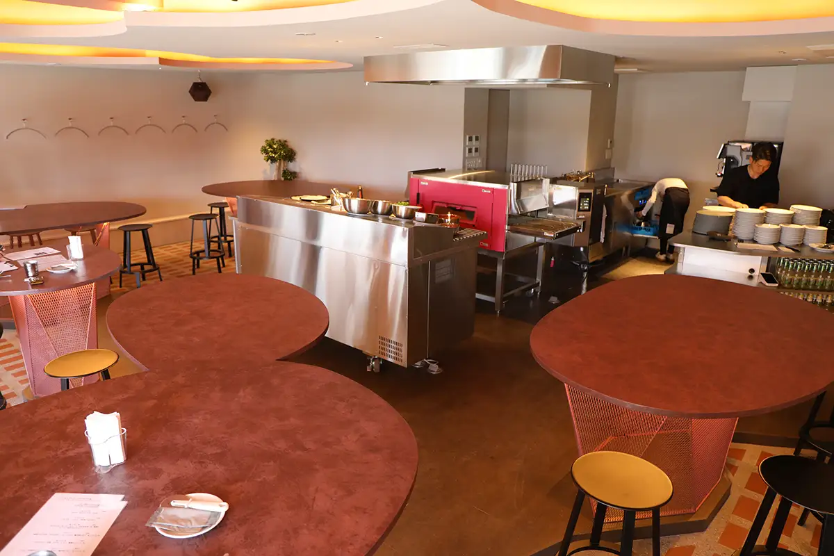 視線が厨房だけに集中しないよう、店内のさまざまな方向へ広がる設計にすることで、訪れる人それぞれが思い思いの時間を楽しみながらも、同じ空間を共有できる雰囲気を生み出しています。