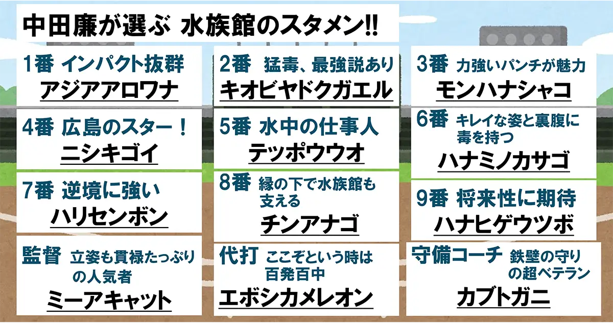 今回の企画について中田氏は、「飼育員の方と相談しながら最強のスタメンを決めました。スタメンに選ばれた生きもの、選ばれなかった生きものたち、一致団結してご来場の皆様に素晴らしいパフォーマンスをお見せできればと思います!」とコメントしています。