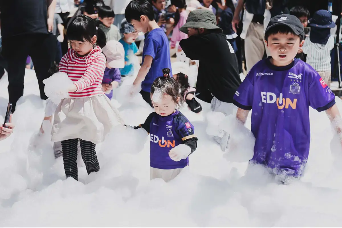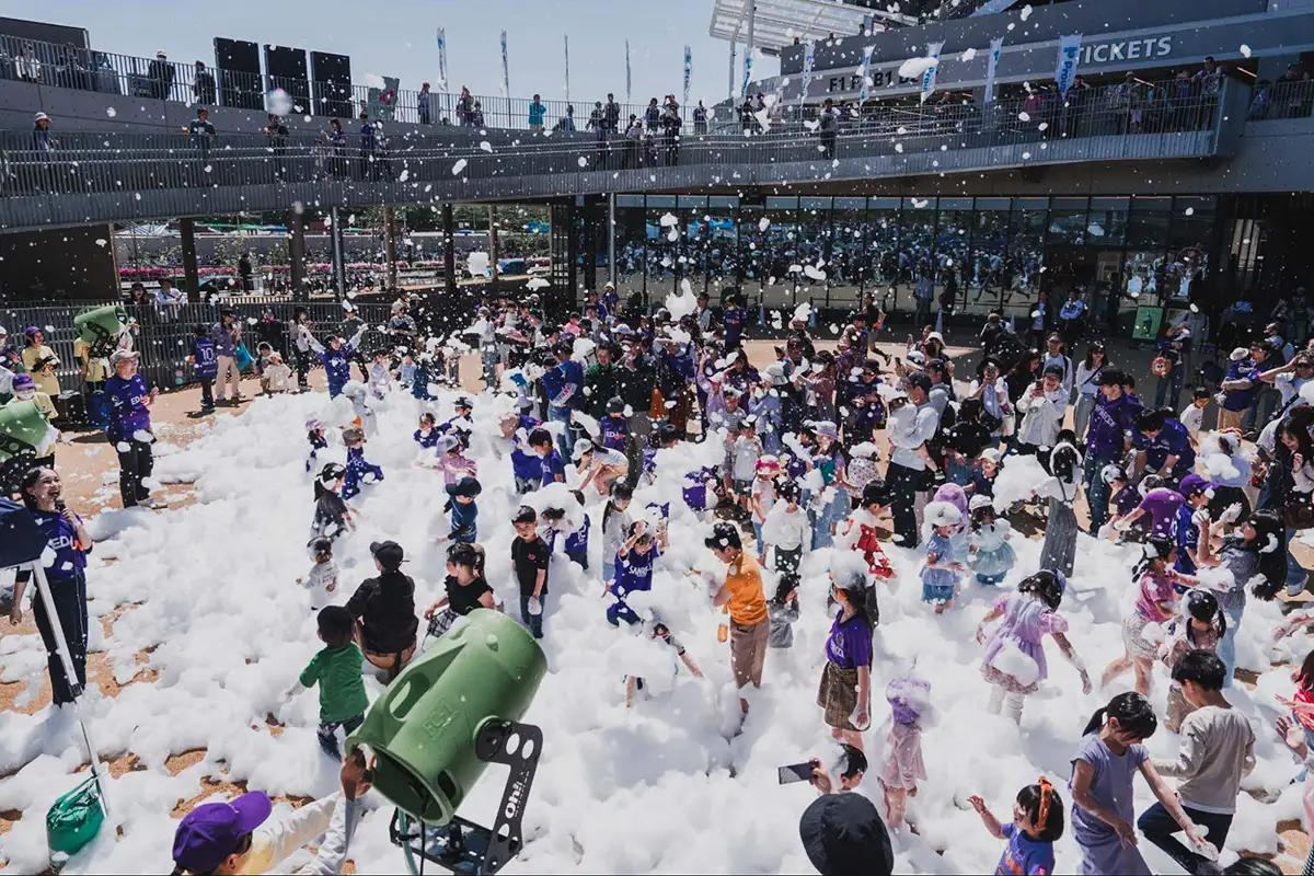 スタジアム内の特設エリアでは、クラブマスコットとともに大量の泡に包まれながら、音楽に合わせて踊る特別な体験が楽しめます。