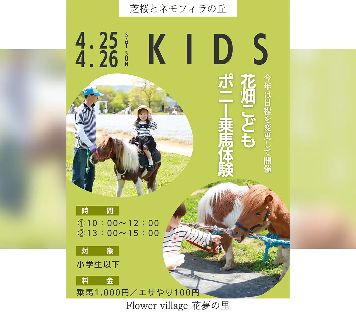注目の企画として、「花畑ポニーこども乗馬体験」も行われます。花畑の中でポニーとふれあえる人気イベントで、小さな子どもにとって特別な思い出になるようなコンテンツとして用意。今年は開催時期が少し早まり、ひと足早い「こどもの日」を楽しむ機会としてもおすすめです。