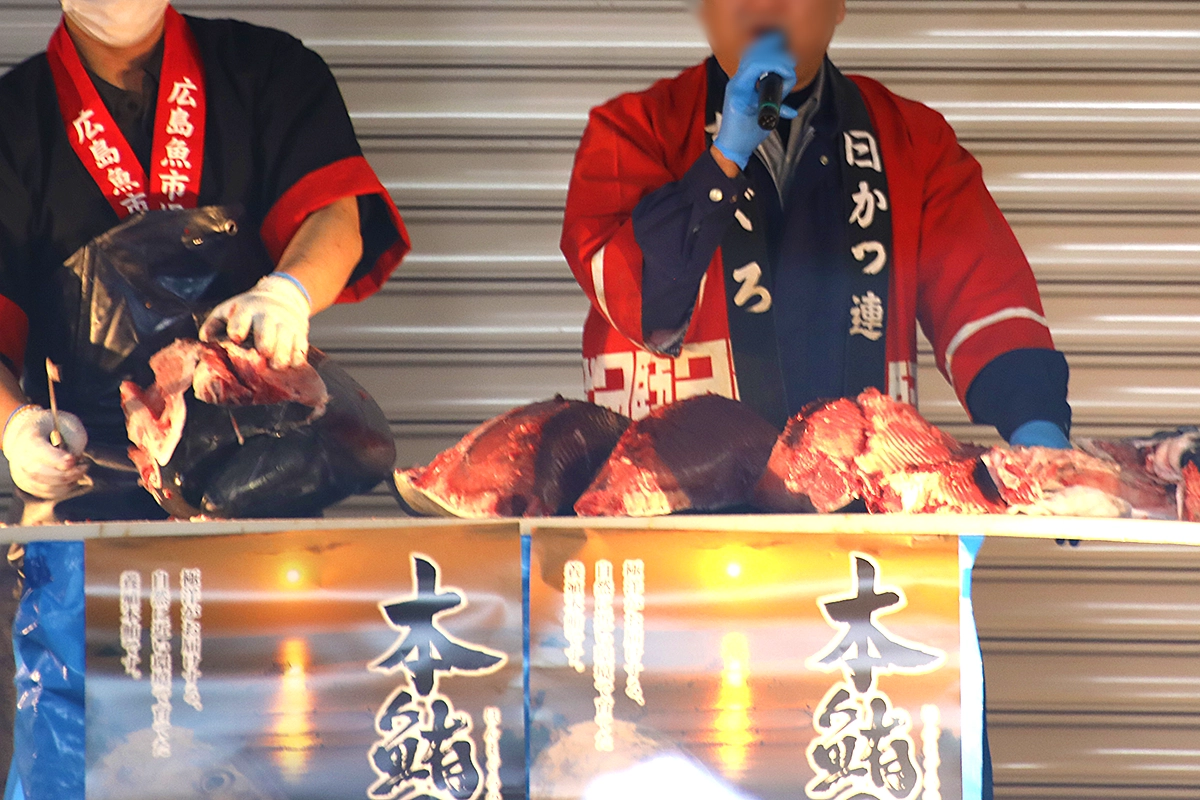普段なかなか見ることのない迫力の包丁捌きを目の前で見学できる大人気解体ショー。大型の養殖マグロを職人が目の前で解体し、即売会が実施されます。