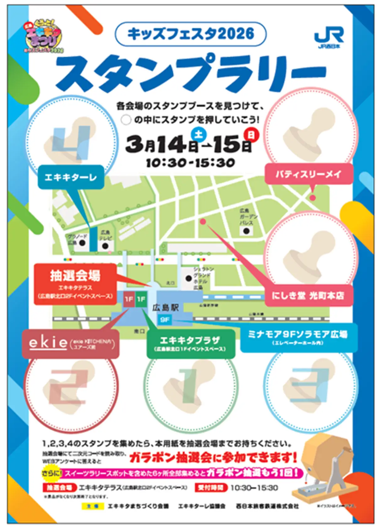 広島駅とエキキターレを巡ってスタンプ4個を集め、ガラポン抽選会に参加しよう!