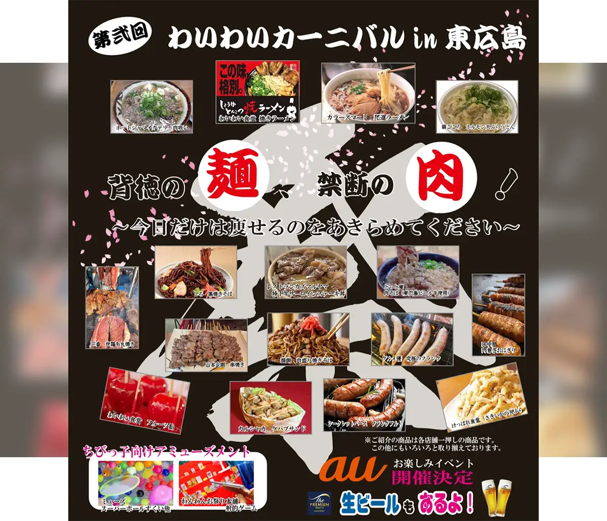 今回は麺と肉料理を中心テーマに掲げ、焼きラーメンやホルモン天ぷらうどん、尾道ラーメンや肉吸いなどのグルメブースが会場を彩り、バラエティ豊かな味わいを楽しめます。